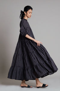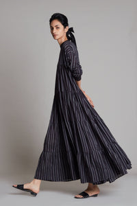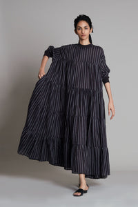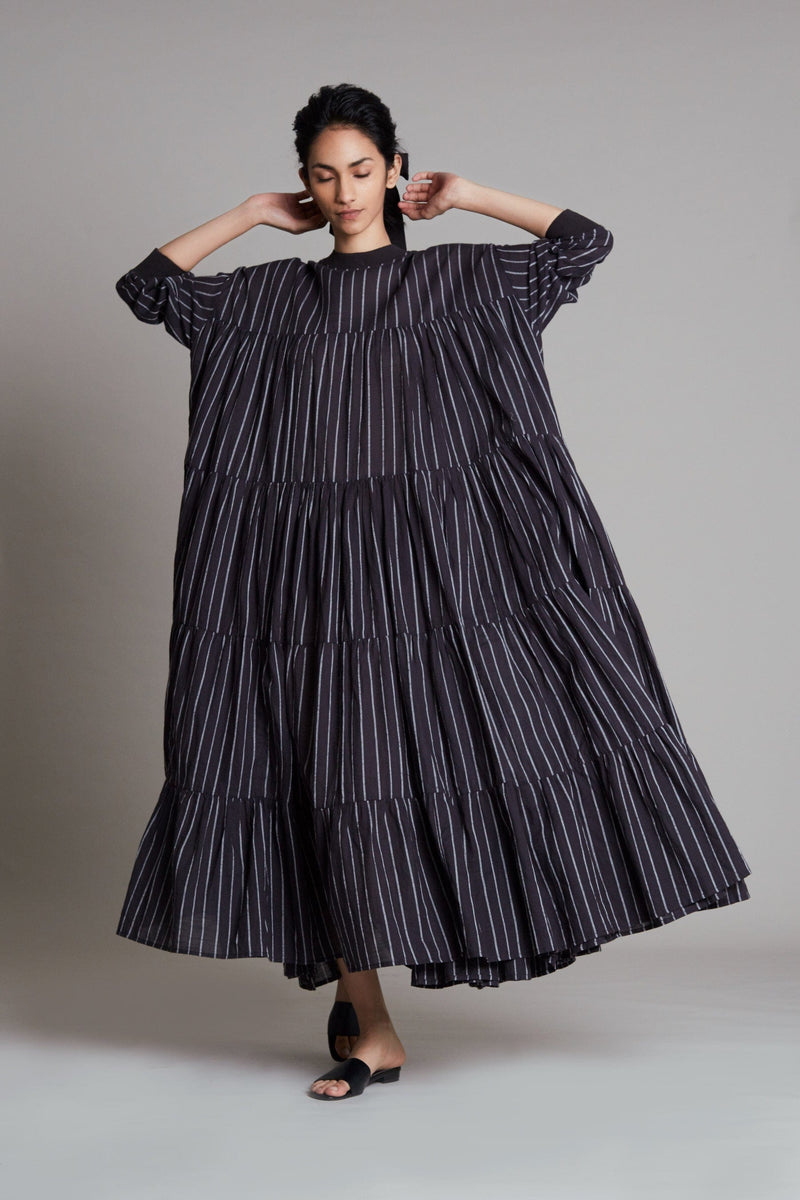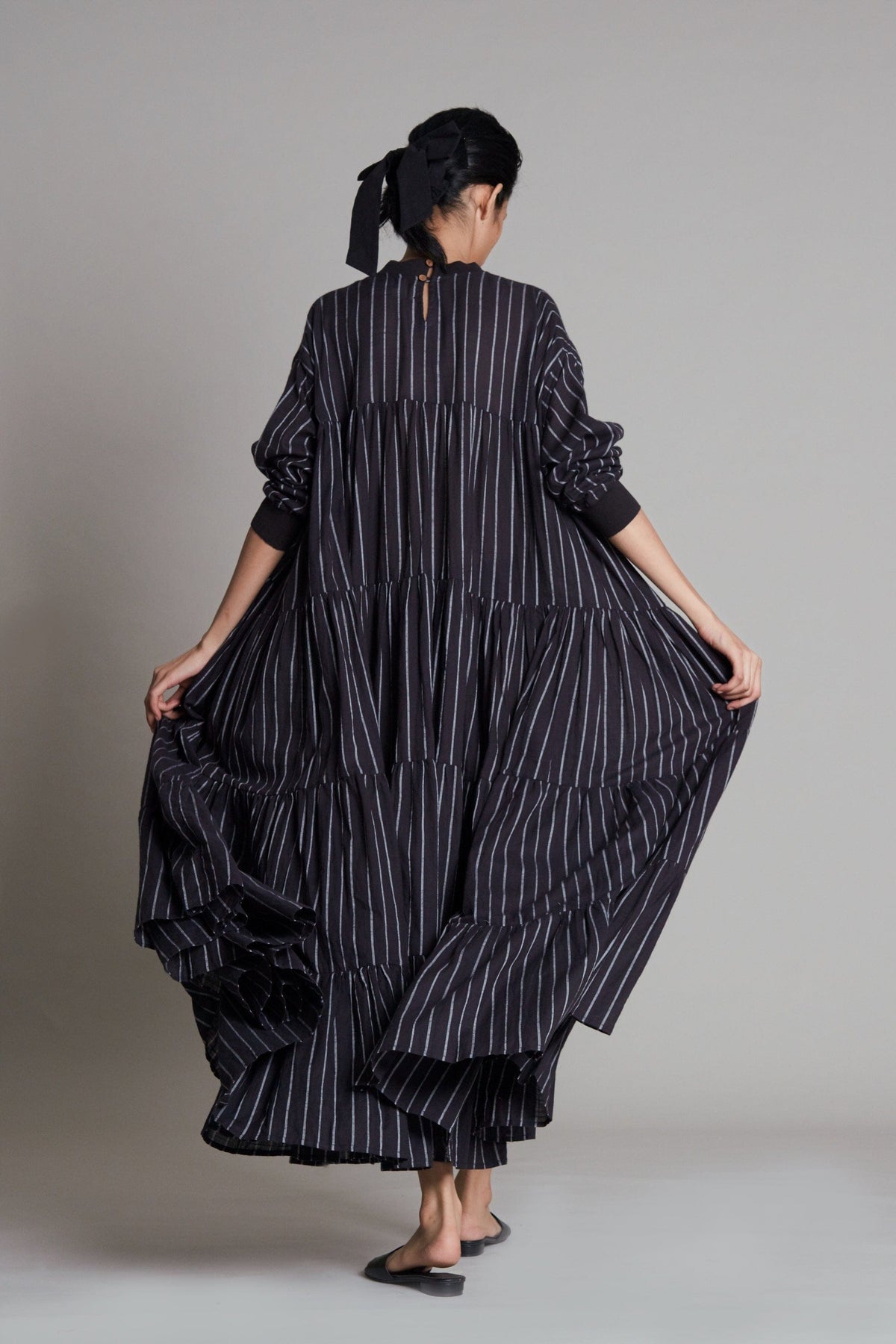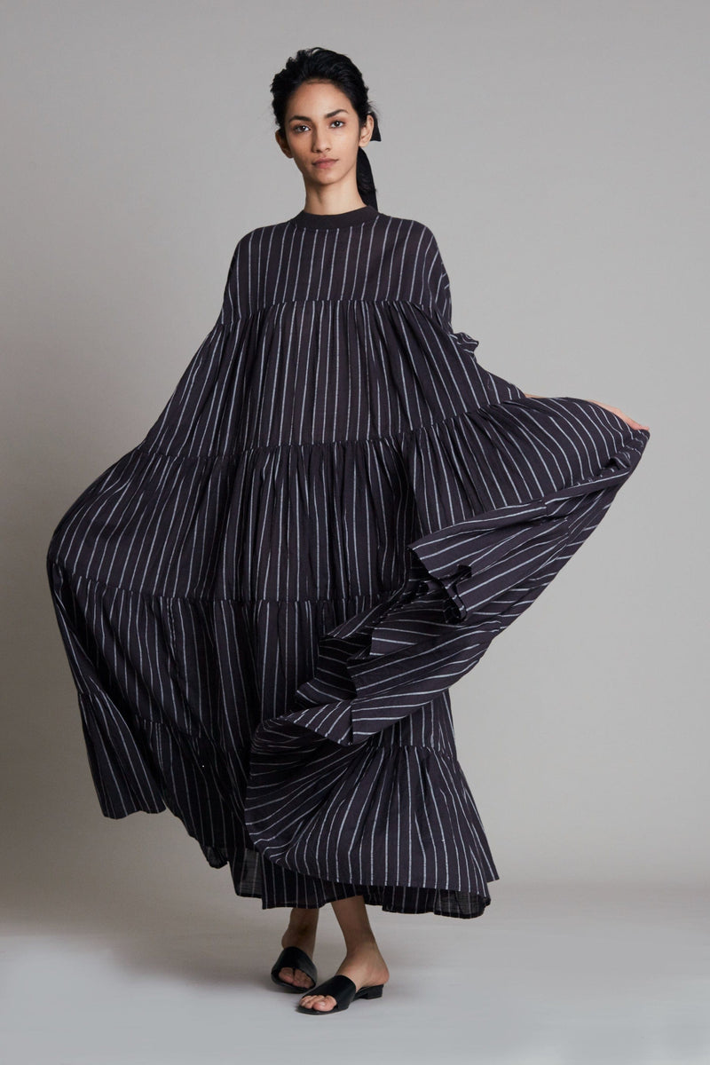 Made in MATI signature stripes this voluminous frilled Rib veena is a perfect dress for special occasions. Rib detailing around the neck and the sleeve adds character. It is cut in airy striped handwoven fabric. Style it with some golden hoops and stilettos for a party look.