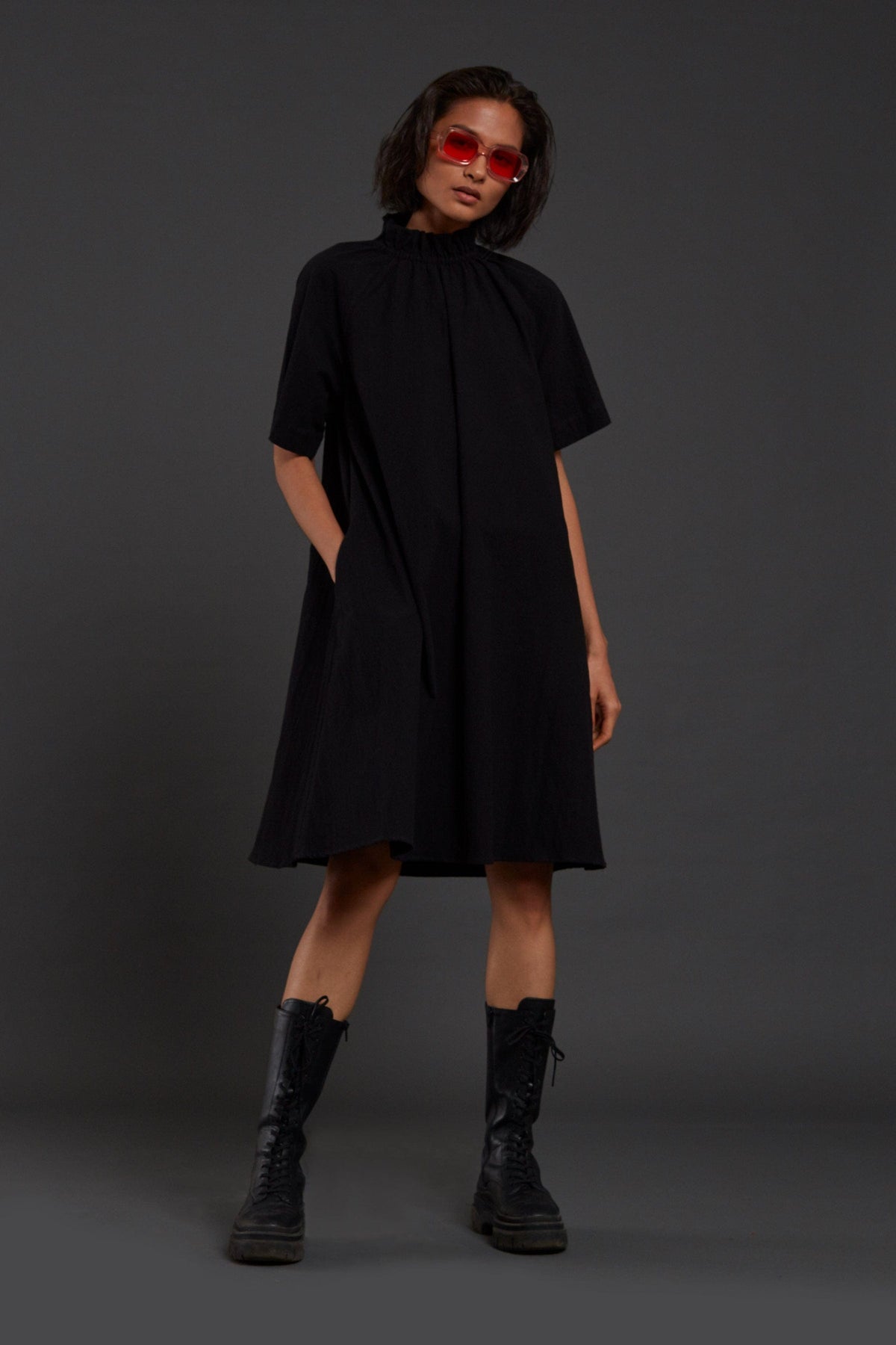 Midi length shift dress with elasticated neckline and raglan sleeves. Comes with side pockets.