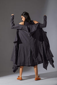 An interesting and modern take on a stripe shirt. With a simple placket in front and elastic on the sleeves it gives a chic look from the front. From the side it surprises with intricate pleated shoulders and makes a statement. Team it up with our stripe pants and sport it as a set. This set comes with a dress and jacket.
