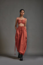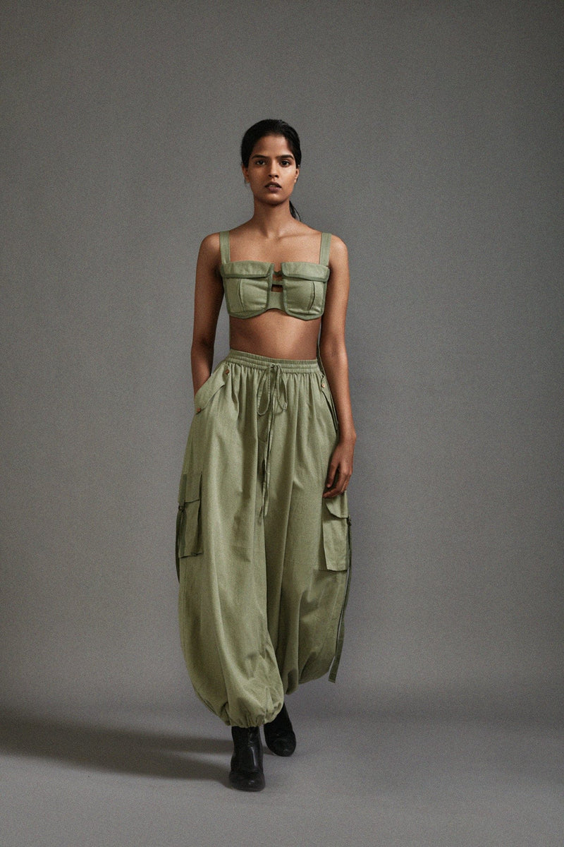 A Baggy-fit cargo pants with strap detail on safari pockets. Elasticated at the waist and hem.