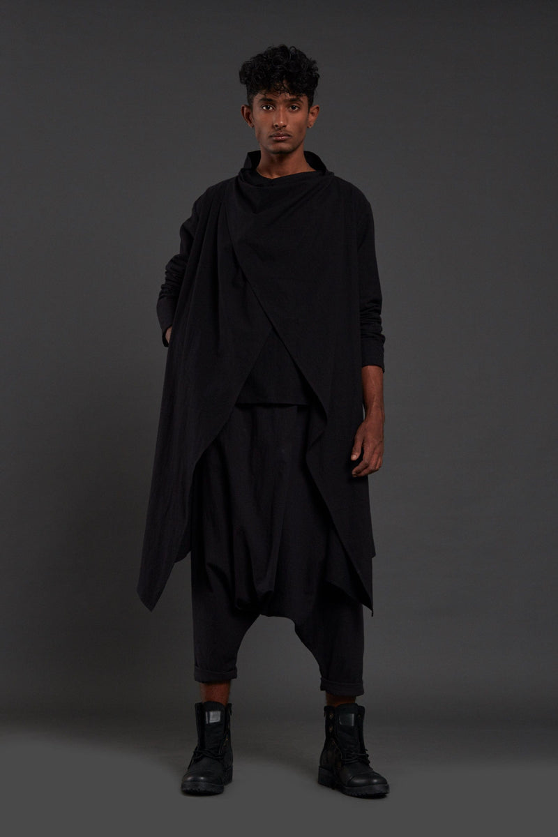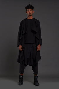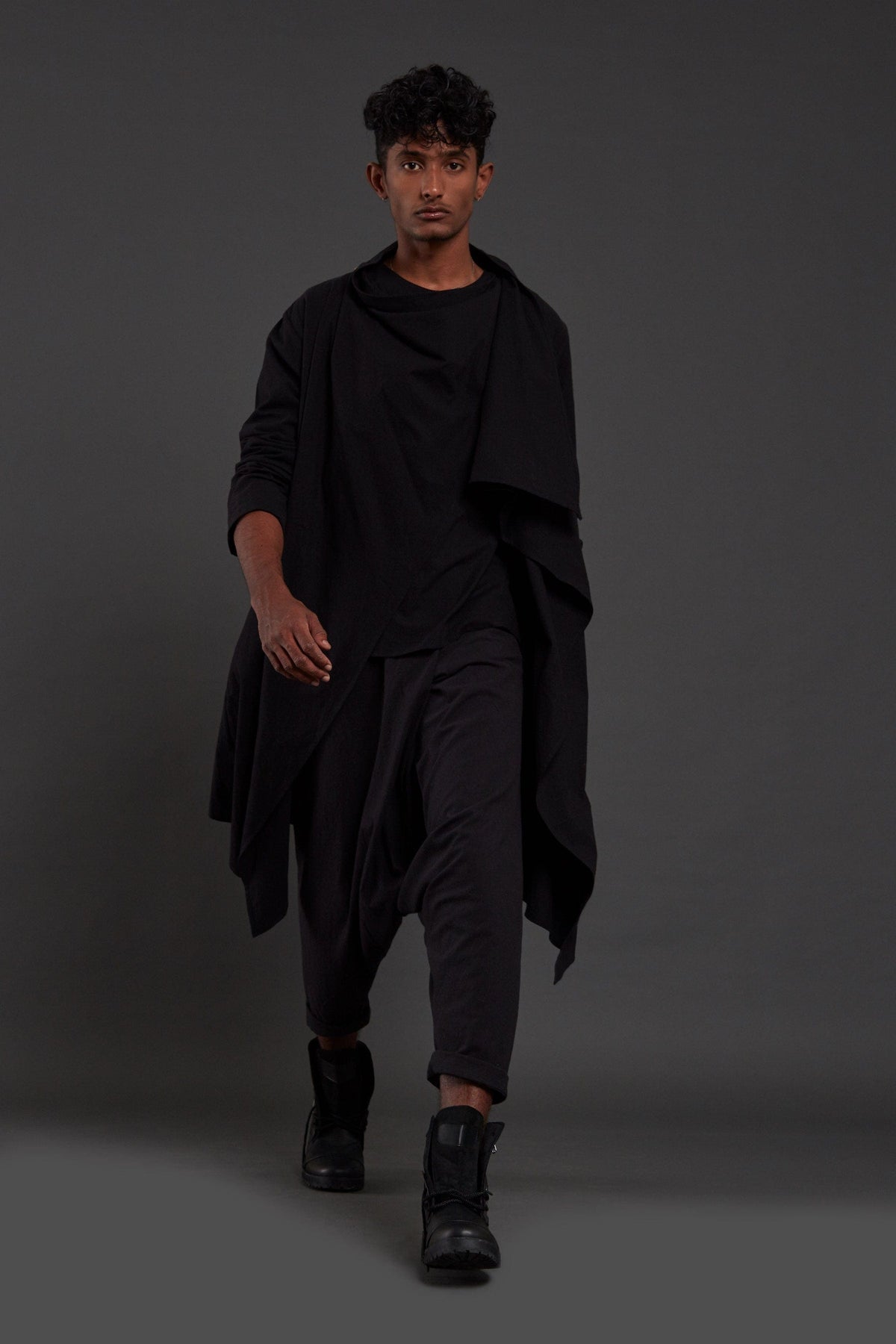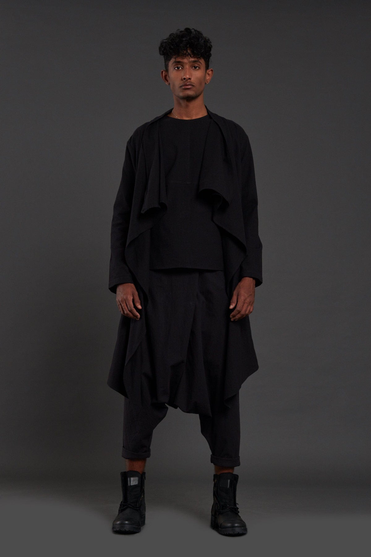 Three-piece set which includes a three-way jacket, drop crotch pants, and a t-shirt.