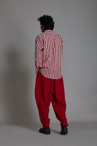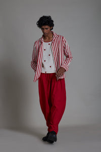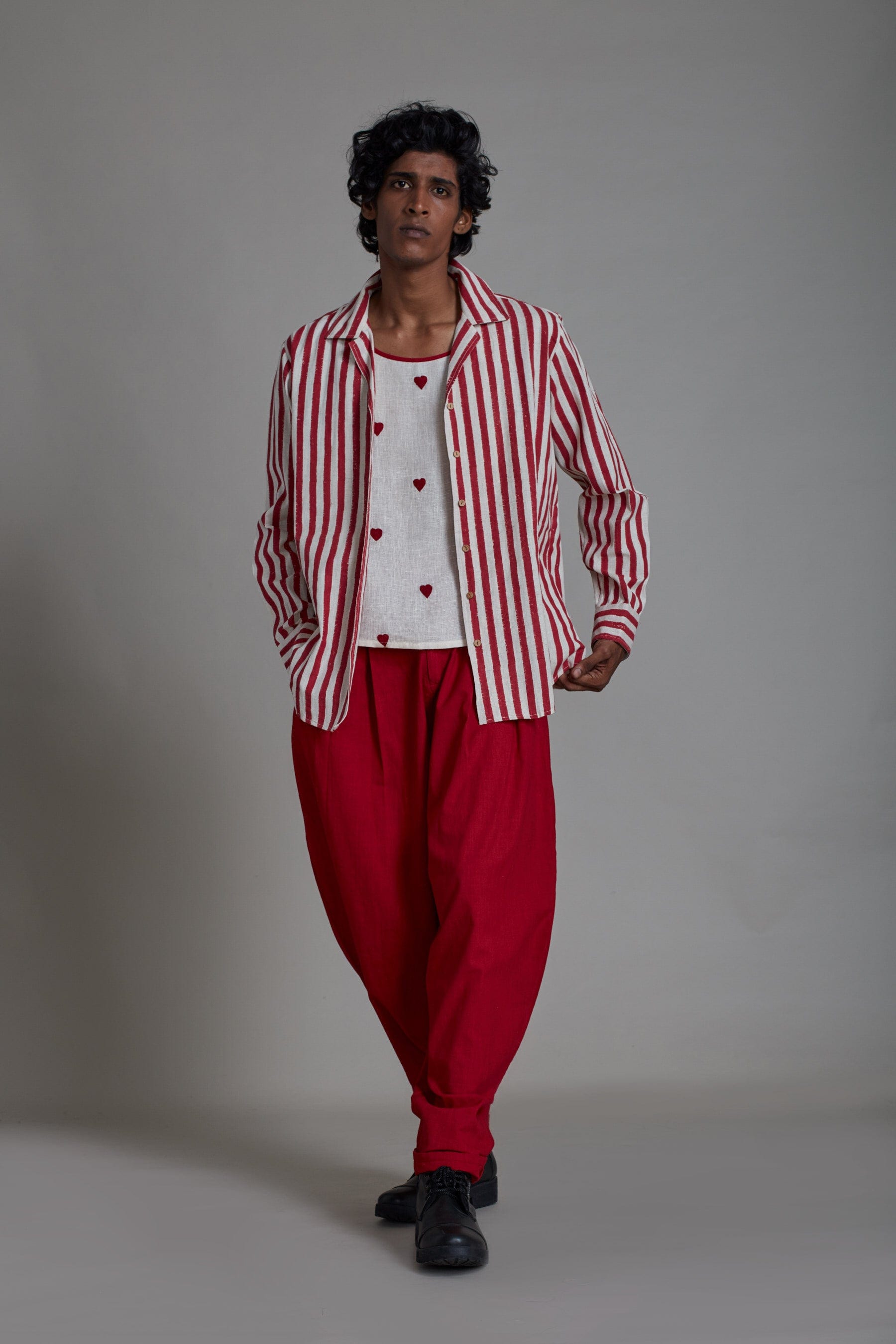 This ensemble consists of a round neck embroidered tank top, relaxed fit balloon pleated pants, is breezier and comfortable with side pockets, elasticated at the back for better fit and comfort, and hand block printed striped shirt with notch collar to give an edgier and smart look. Style this outfit with boots and hit the road in style!! (set of 3)