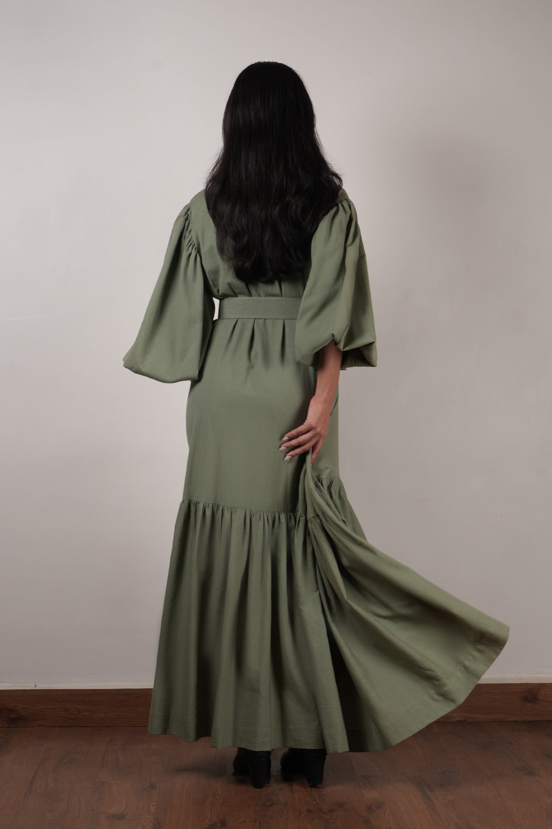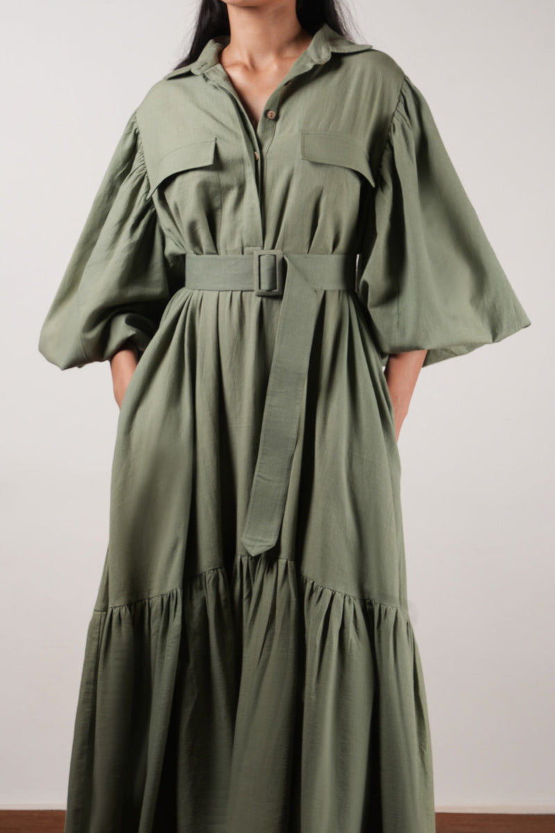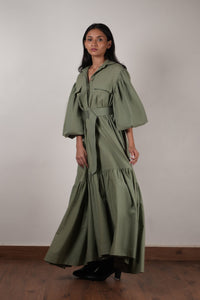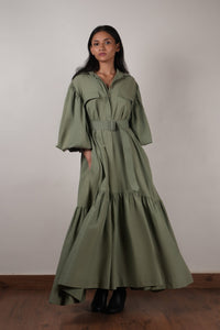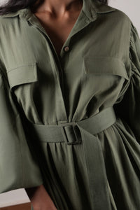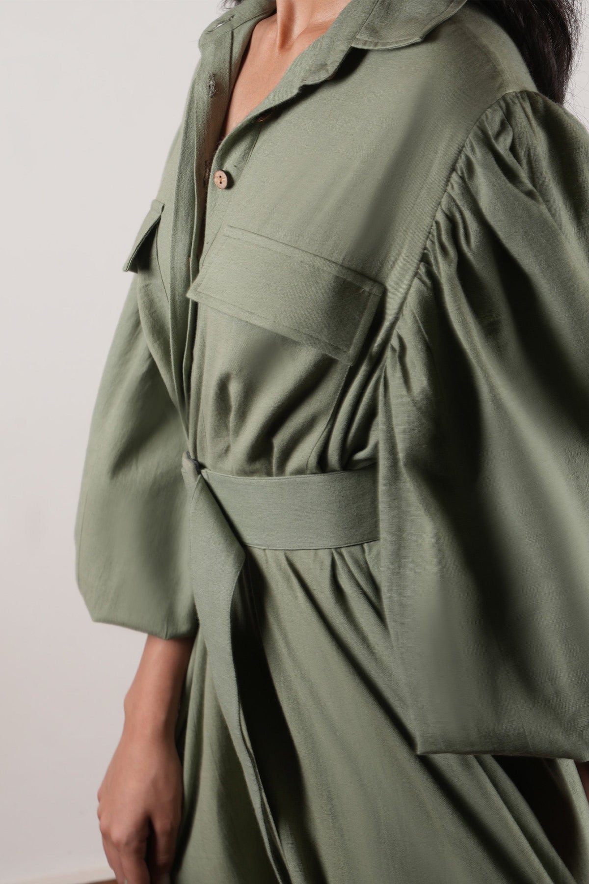 Made from luxurious handwoven cotton slub. The loose fit, voluminous blouson sleeves and swishy pleated hem add to the breezy, carefree feel.Comes with a waist belt. Have fun styling yours with boots !!