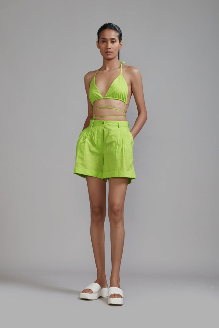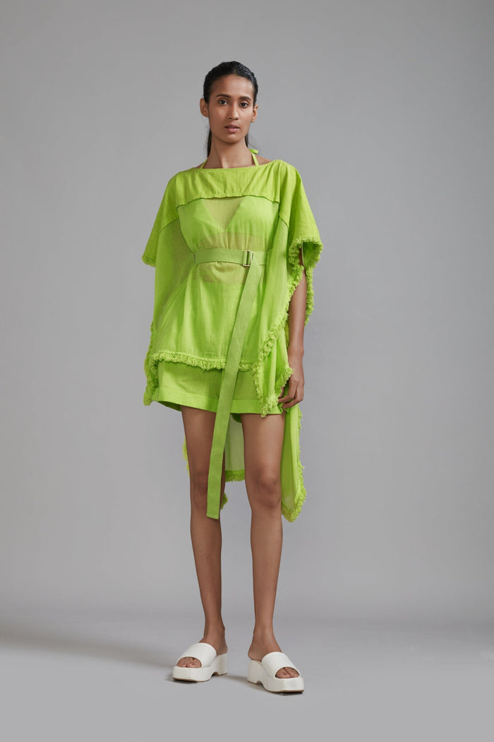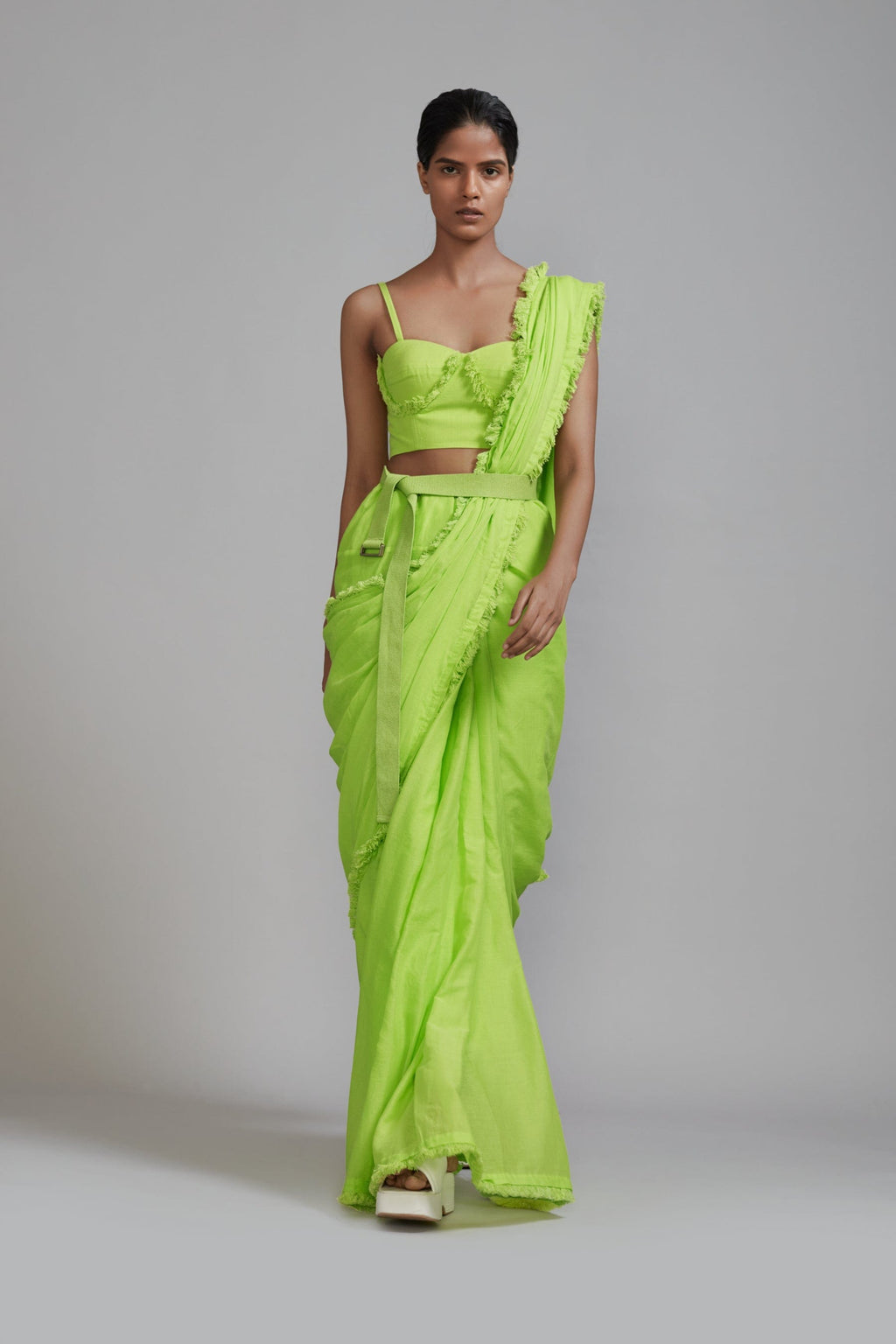 Off-White with Neon Green Saree & Fringed Corset Set (2 PCS)