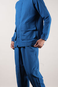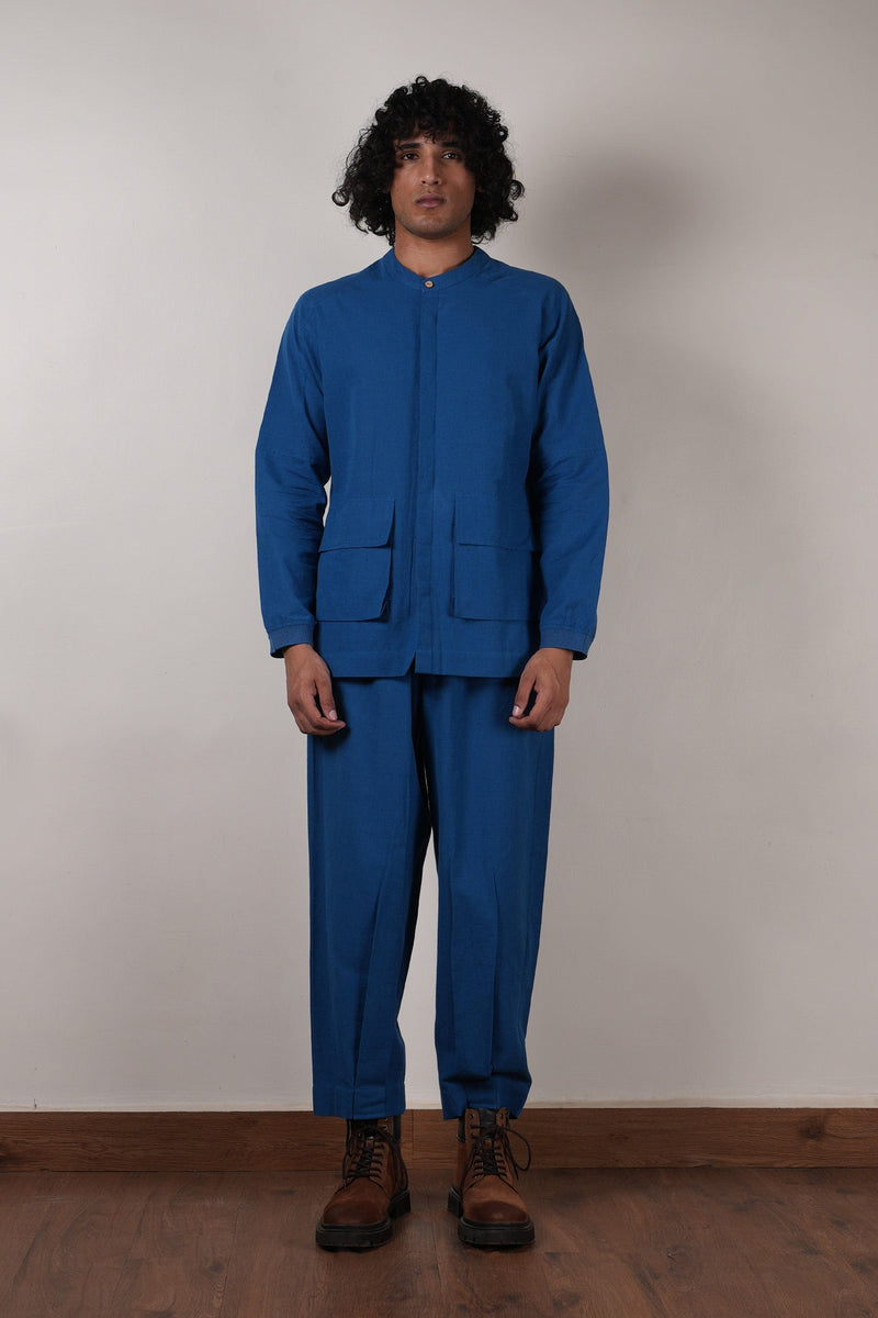 A sleek shirt featuring two flap-front pockets, a hidden button placket, and ribbed sleeves , paired with tailored straight pants for a classy look.