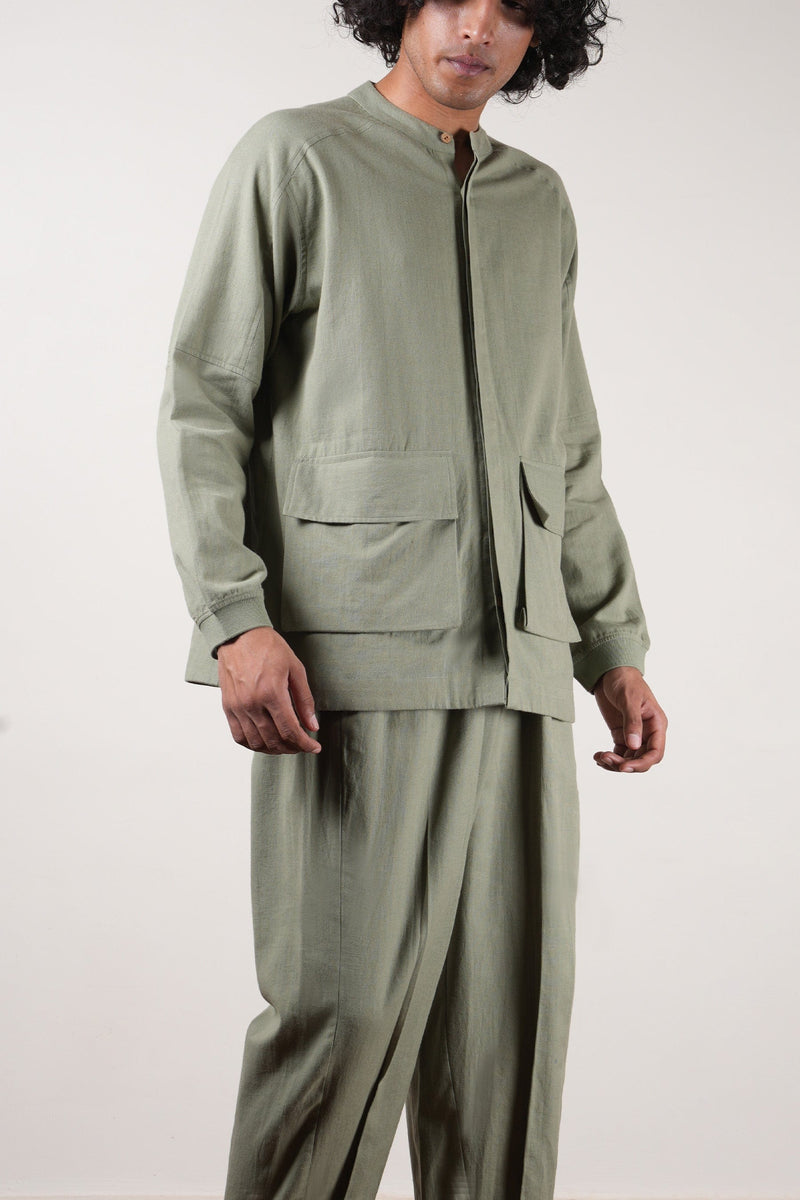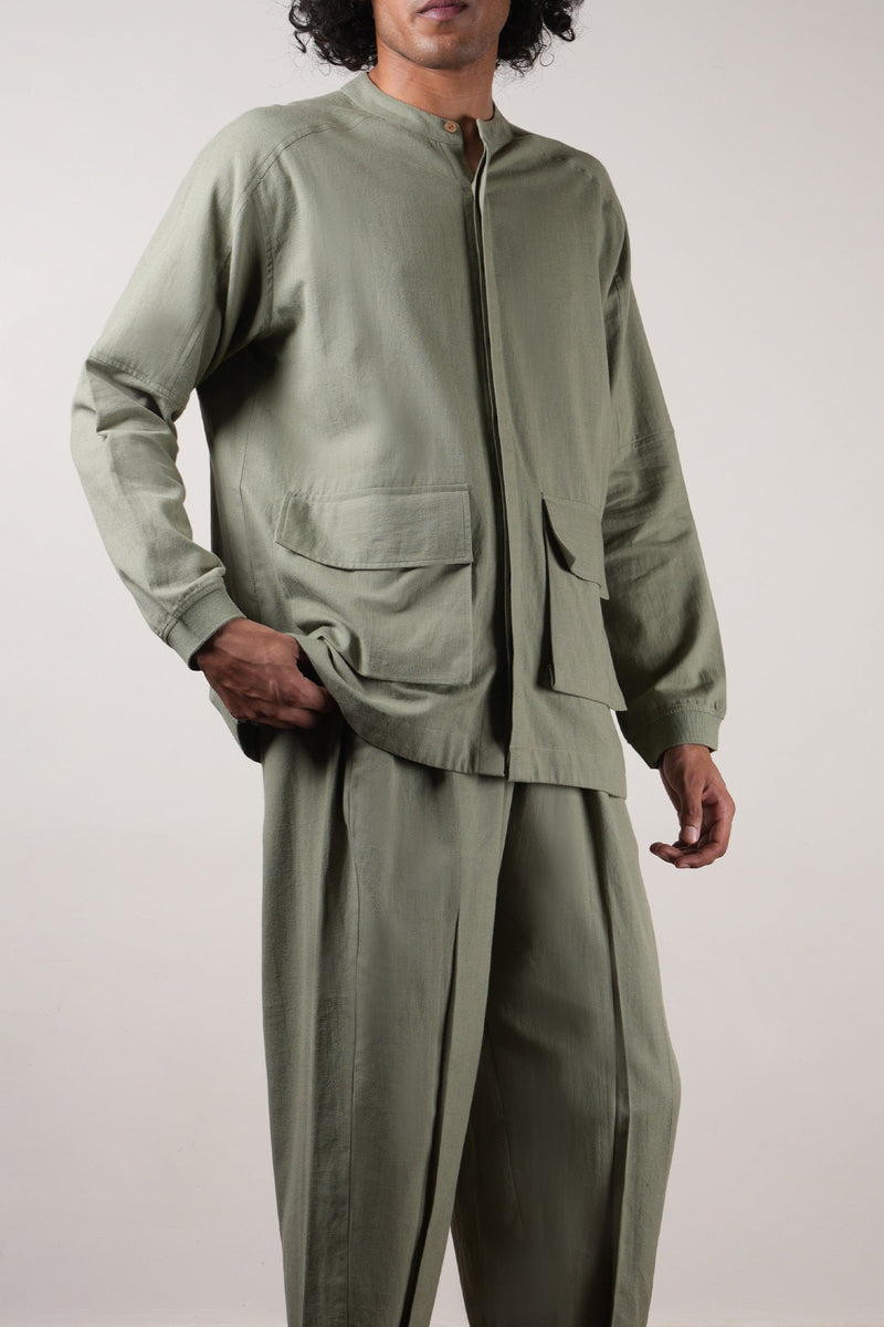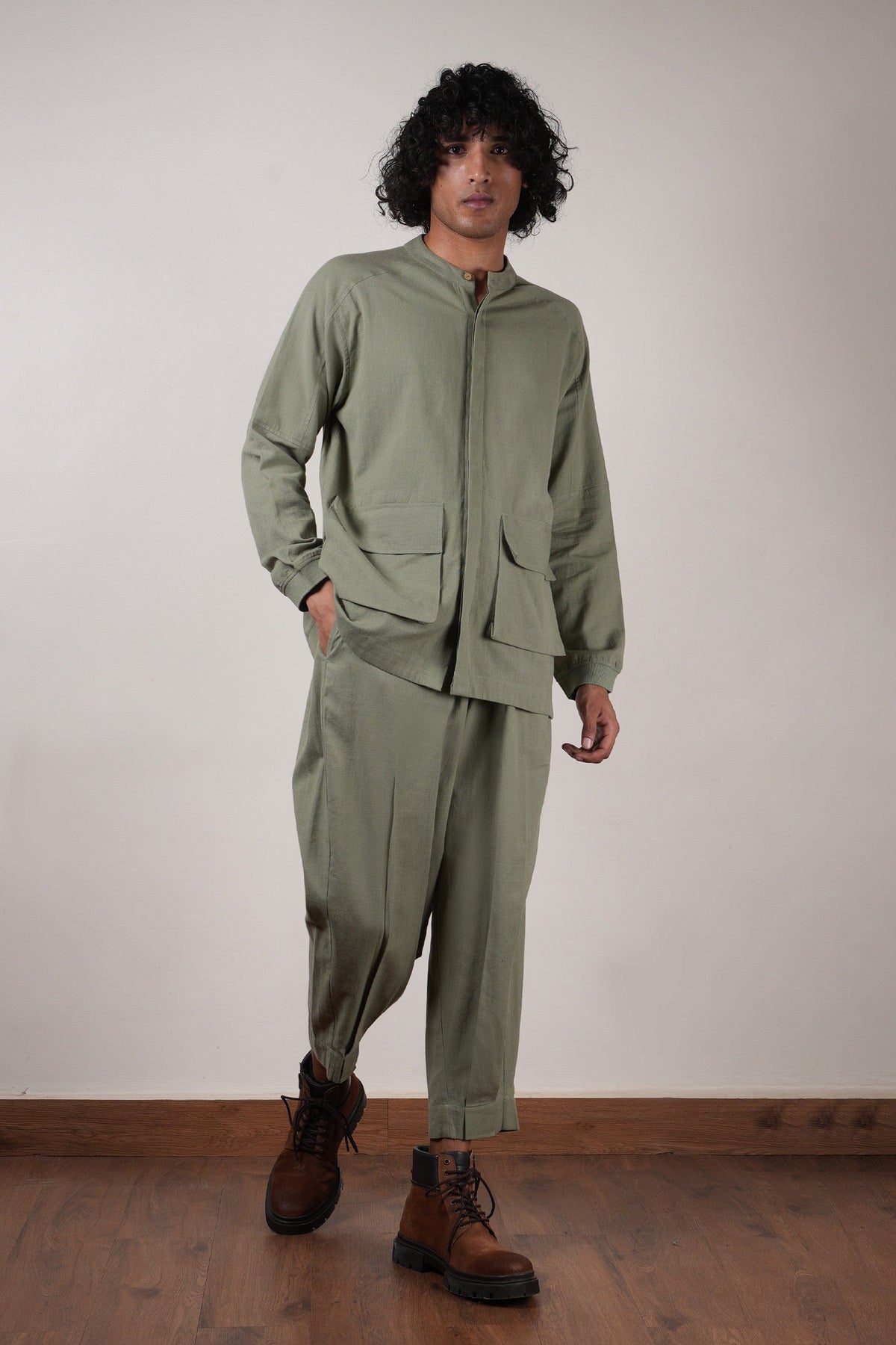 A sleek shirt featuring two flap-front pockets, a hidden button placket, and ribbed sleeves , paired with tailored straight pants for a classy look.