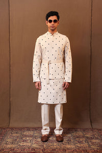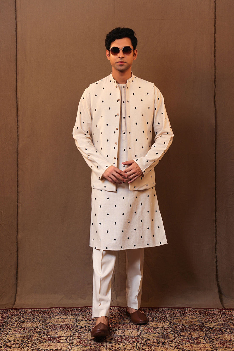 Embroidered bandi jacket in handspun kala cotton. Team it up with the matching kurta and pants to complete the look