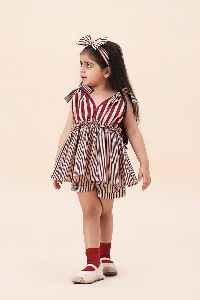Mini MATI Girls Ivory With Mauve Striped Frill Top and Shorts Co-Ord Set (2 PCS)