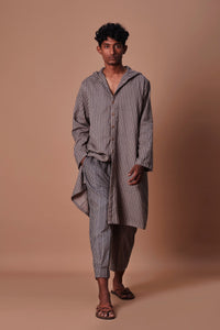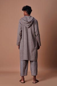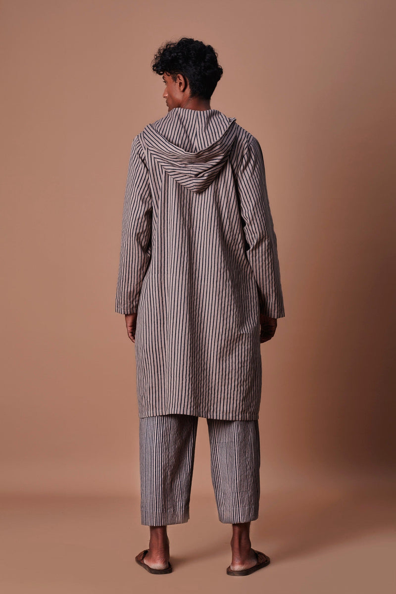 This button-down hooded kurta is a perfect piece to revamp your summer wardrobe. The hand block printed MATI signature stripes and handwoven fabrics makes it more breathable and comfier. Team it up with trouser from our collection and complete the look.