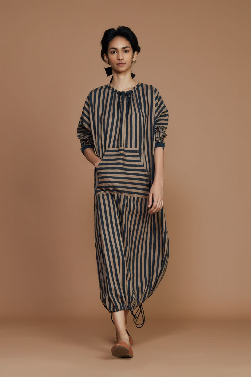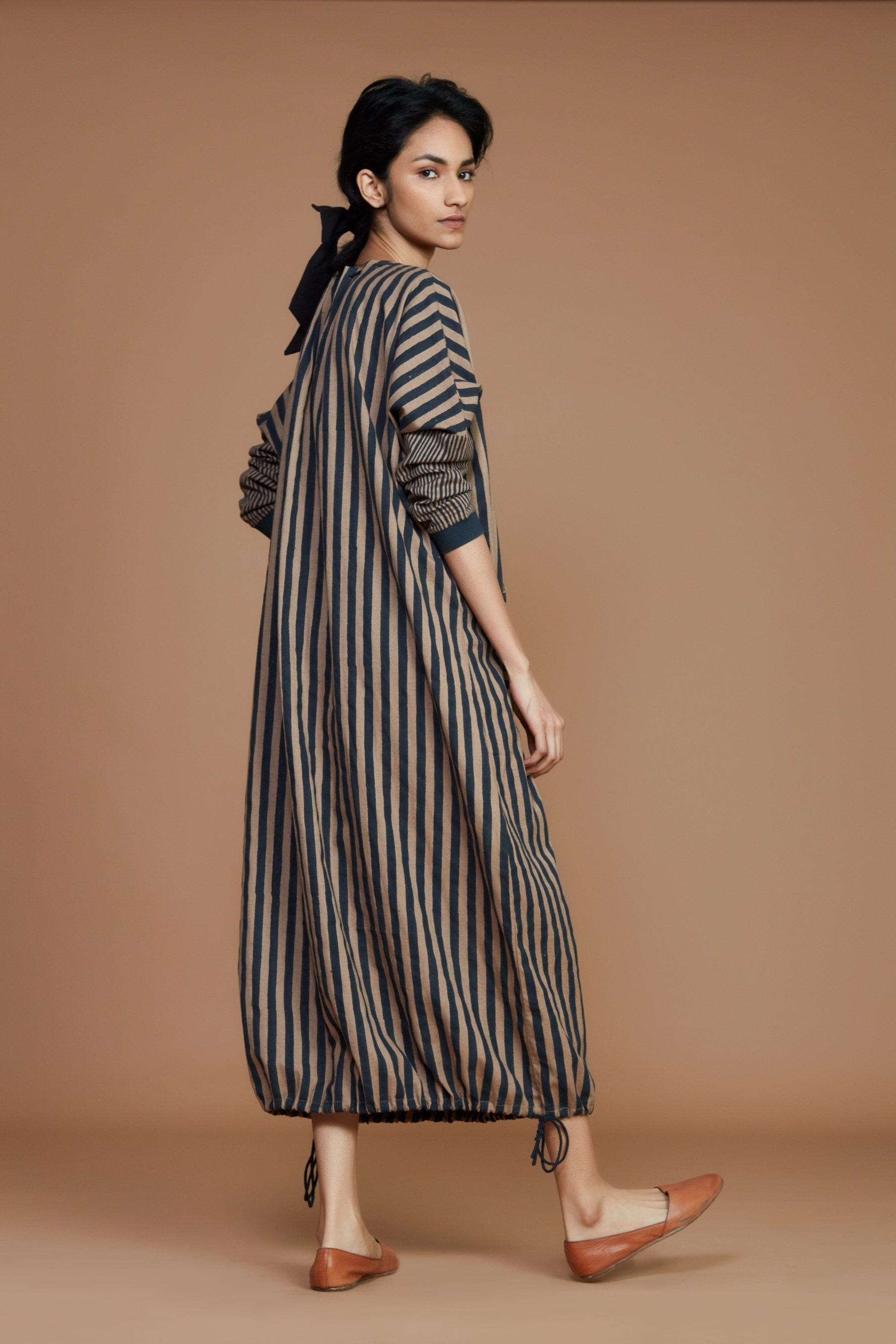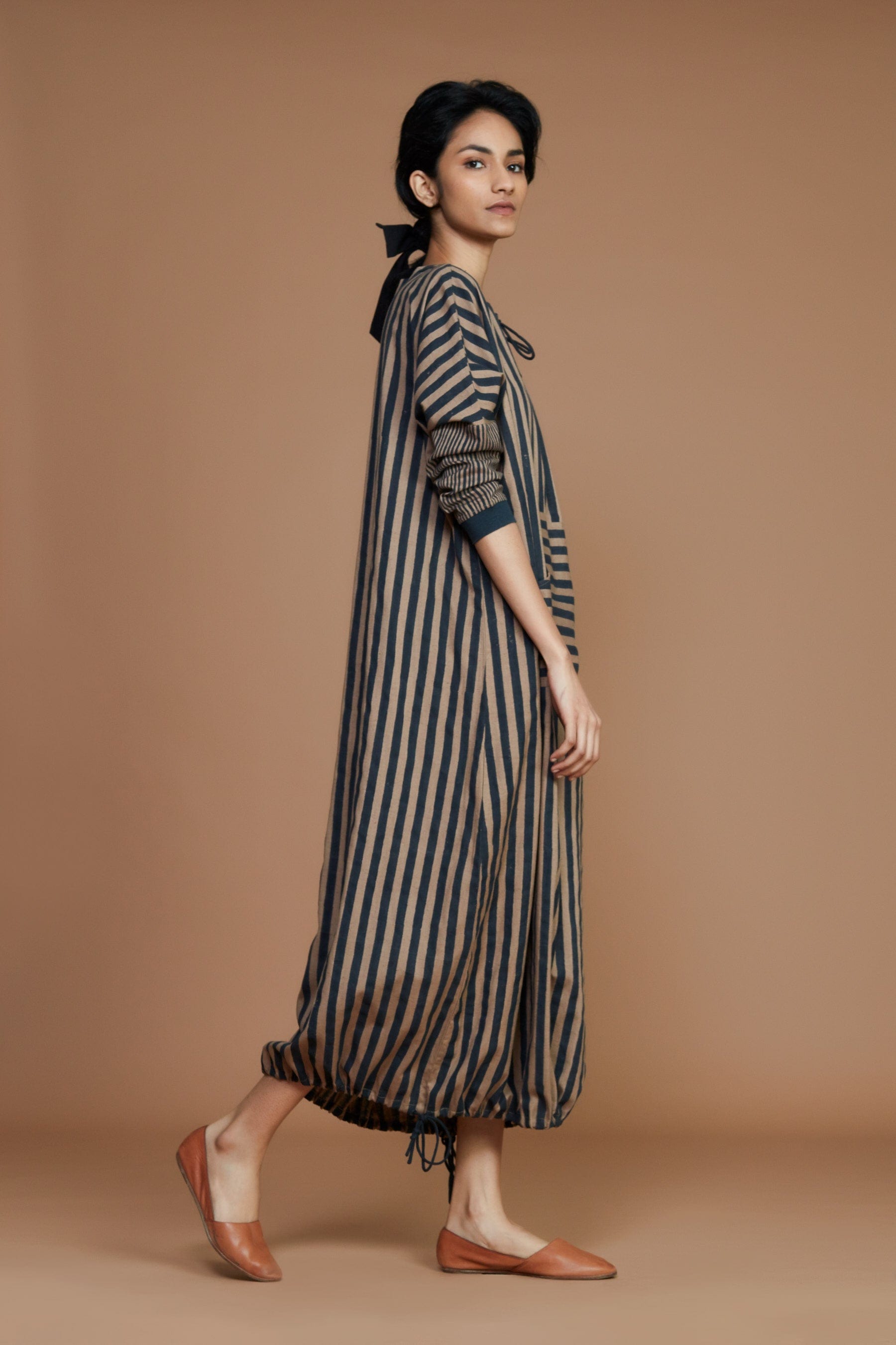 Update your holiday style with this sporty striped dress. It has a draw string neck detail with rivet and a cool rib detail at the sleeve edge. Handwoven fabric and the play of stripes brings comfort and ease to this dress. Style this chic unique sustainable outfit with your boots and you’re good to go!