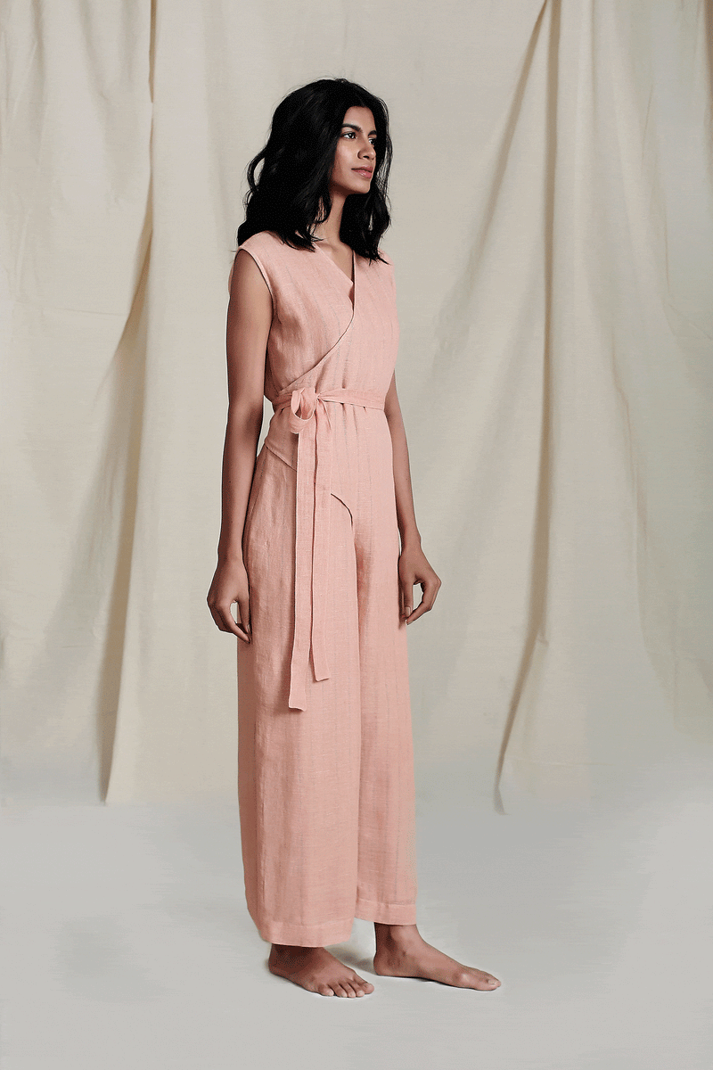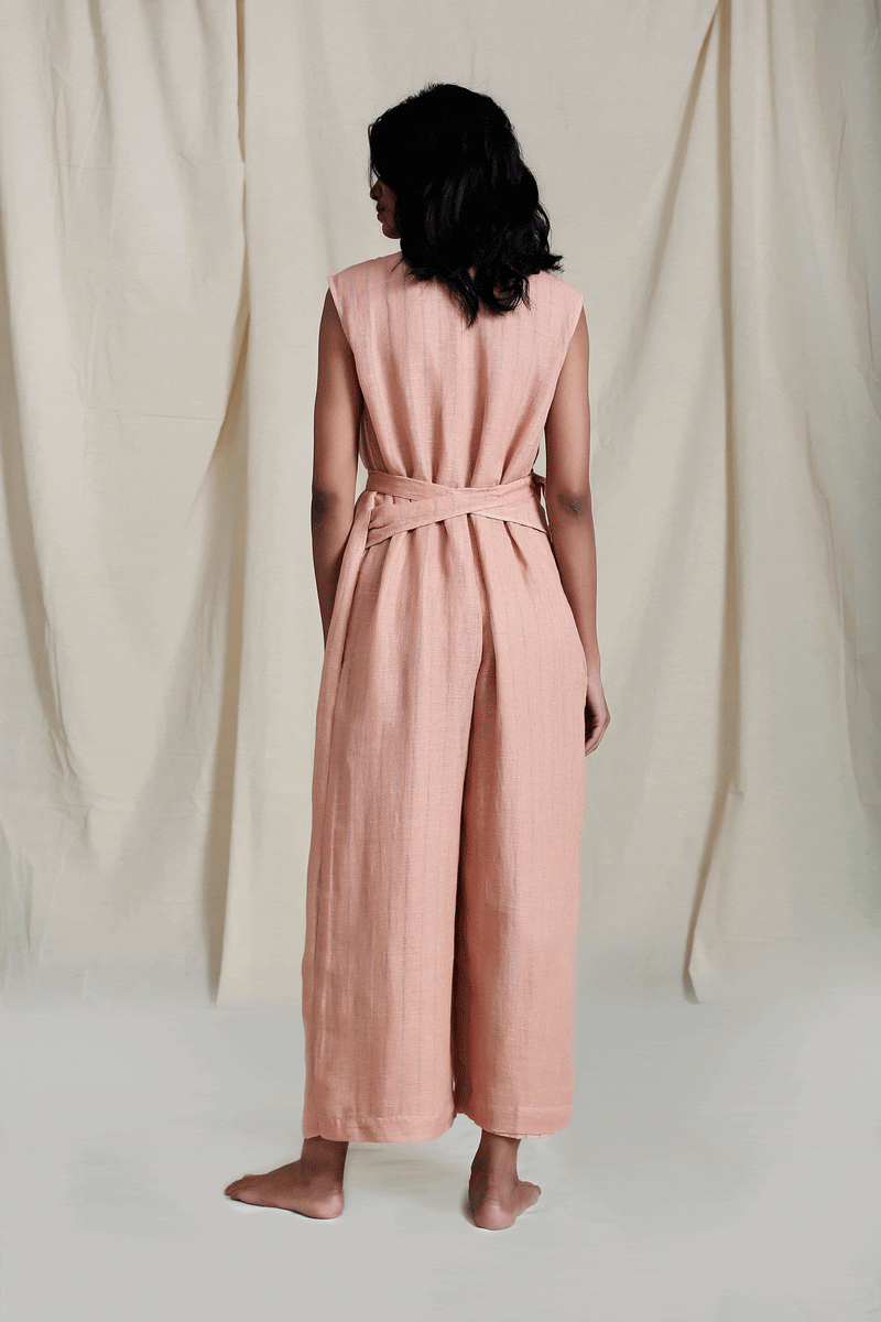 Our new wraparound jumpsuit in sheer linen lined with thin stripe fabric !! The texture of soft sheer linen with stripes showing from under gives this jumpsuit a unique look!!