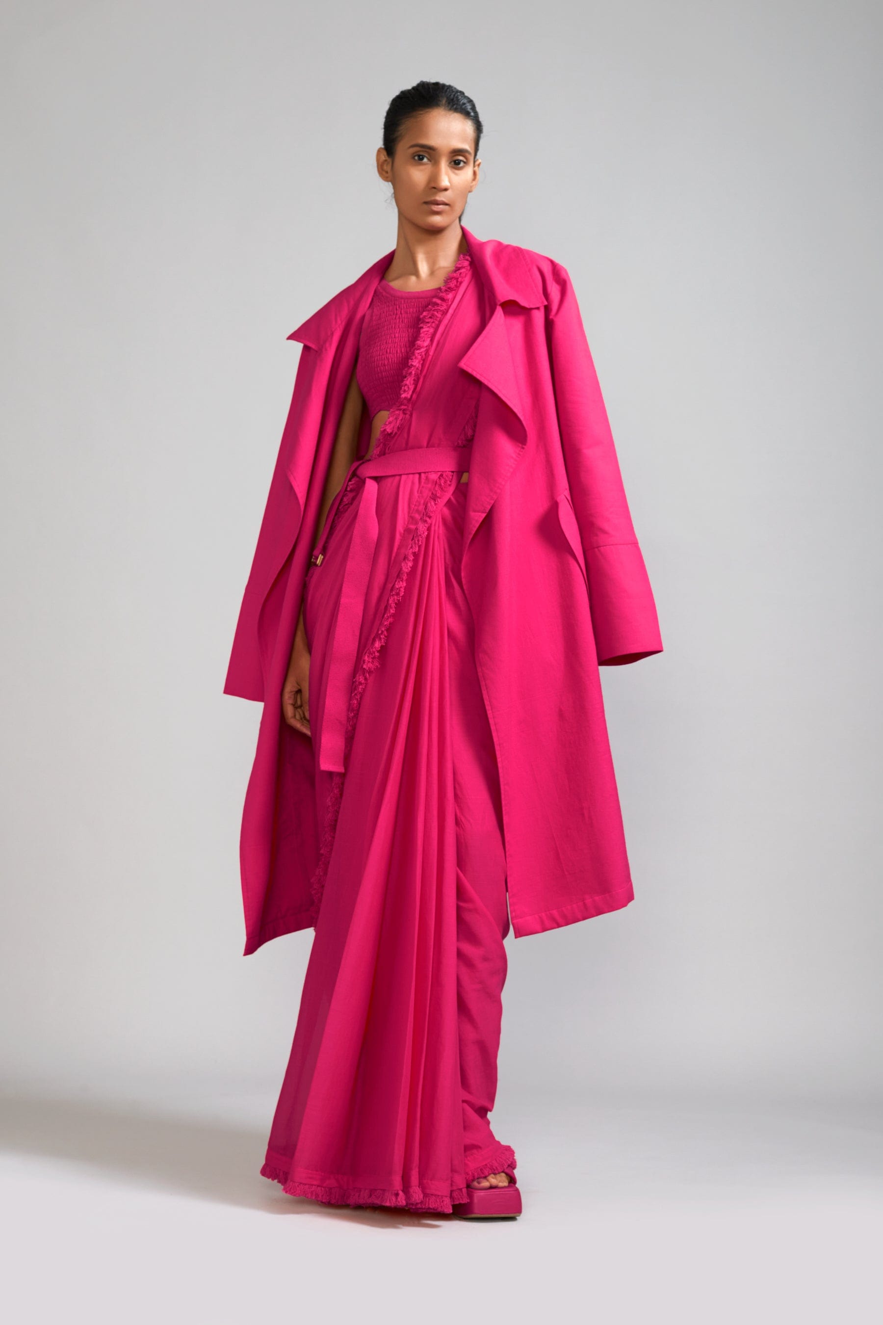 A three-piece set of modern mul saree, smocked bodysuit and a classic trench jacket (Set of 3)