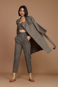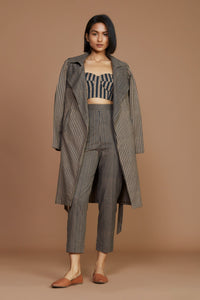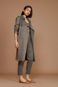 An interesting and modern take on the trench coat. Keep it chic yet sophisticated with this stripe-on stripe. A perfect model off-duty look. The trench includes a double-breasted notched collar and a classy belt detailing at the waist. You can pair it up with  a corset and a tapered pants (elasticated at the back) from our collection or style it separately