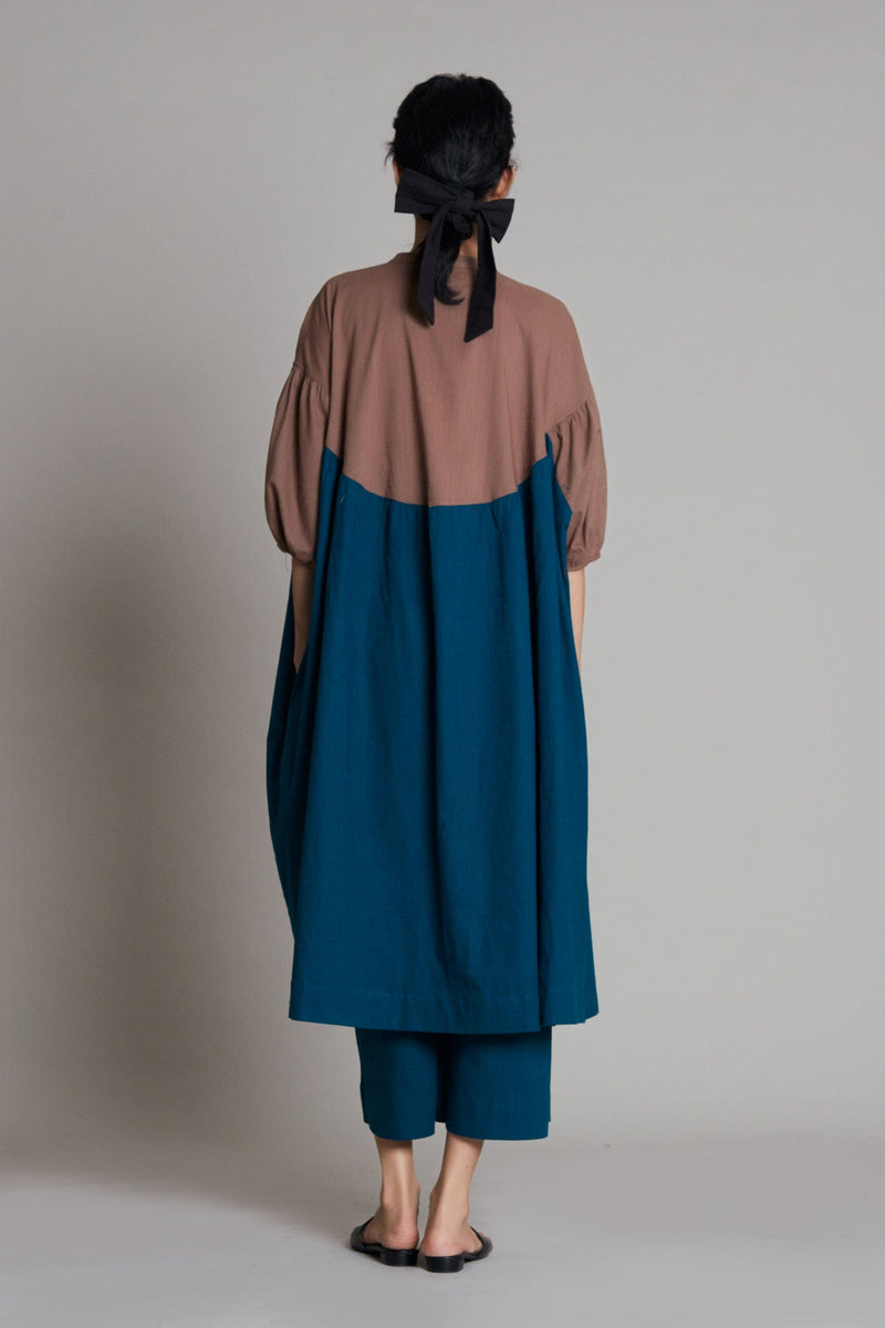 An Anti-fit Color Block Tunic Dress is an Oversized KAFTAN styled silhouette. This breezy and comfortable tunic dress is made with hand-woven fabric. Dress it up with RE pants from our collection or style it separately.