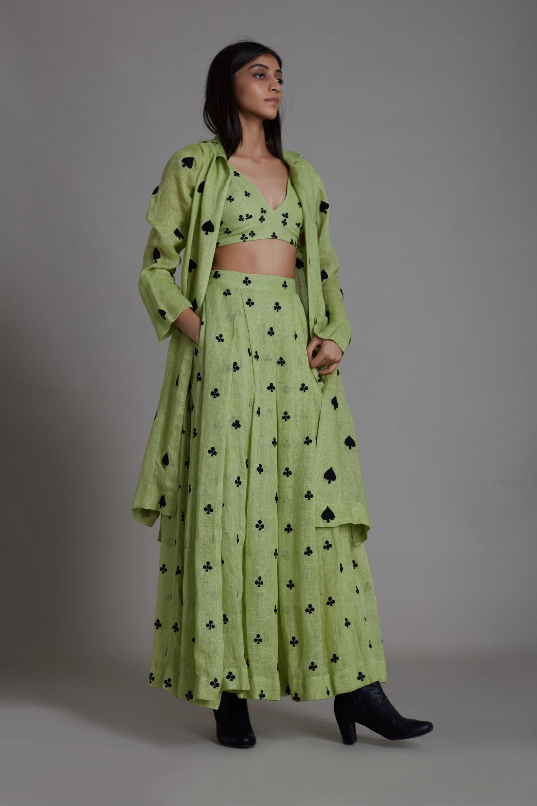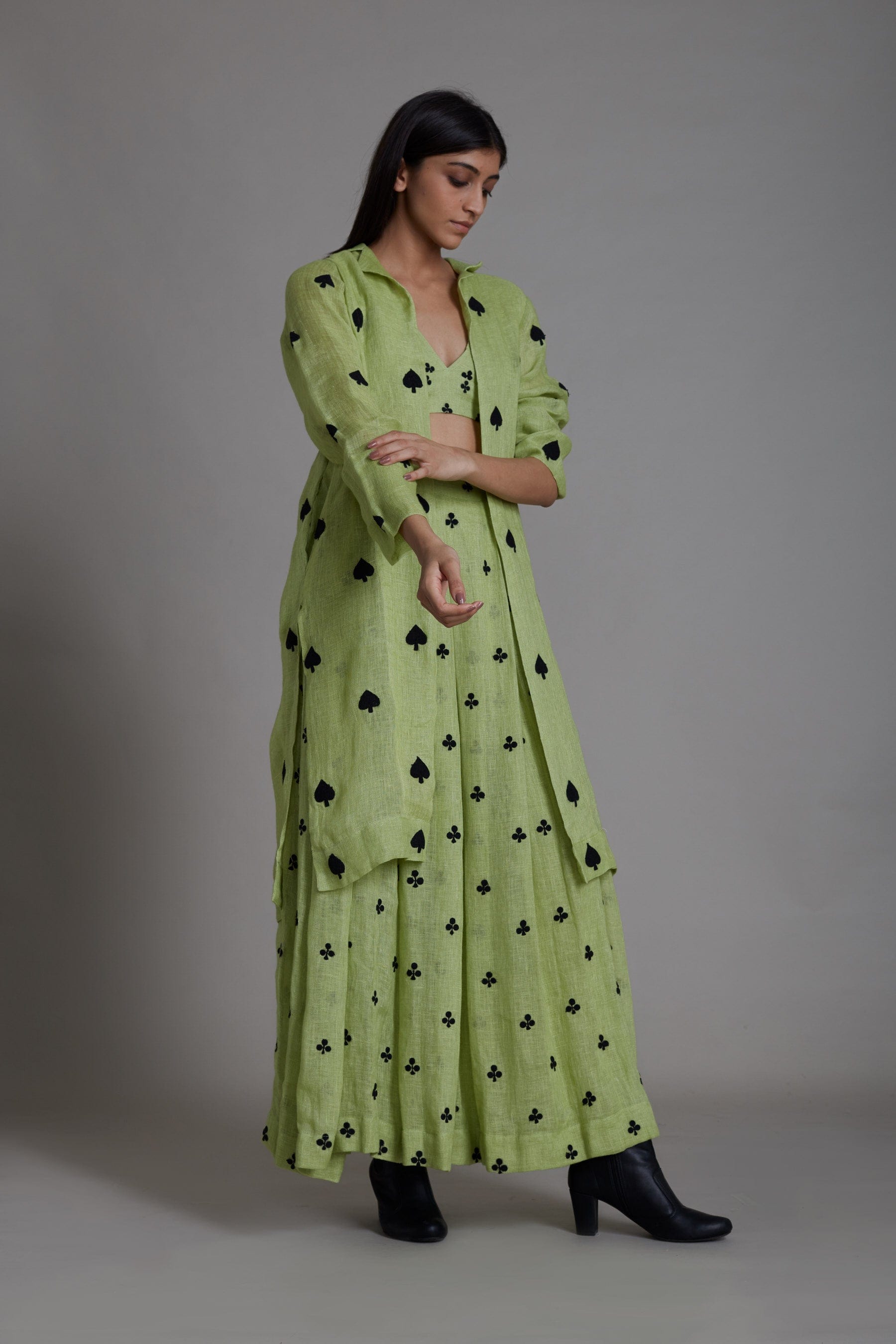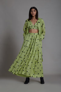 An interesting and modern take on the traditional lehenga set. The bralette and lehenga are made in pure linen with intricate all-over thread embroidery. The set comes with a cover jacket from our collection for a complete festive look.