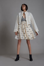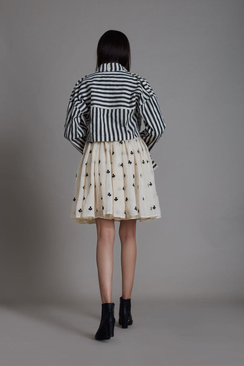 Festive season calls for a mix of soothing embroideries and playful silhouettes. The dress is cut in handloom cotton and rich linen with a tie-up at the back and a mix of stripes and embroidery making it a wardrobe must-have. Style this versatile set together or separately.