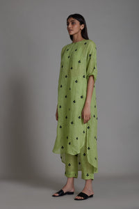 This tunic dress is all that you need for daytime festivities. The apple cut detailing on the kurta brings elegance and class to the outfit. Pair this dress with our trump pants and a potli bag to complete the look