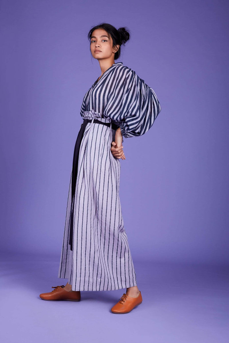 An interesting and modern take of a stripe shirt. With a simple placket in front and elastic on the sleeves it gives a chic look from the front. From the side it surprises with intricate pleated shoulders and makes a statement.Team it up with our stripe pants and sport it as a set.