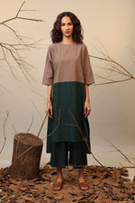 A short-long colour block tunic with back button opening teamed up with the capre pants with side pockets and full elasticated waist.