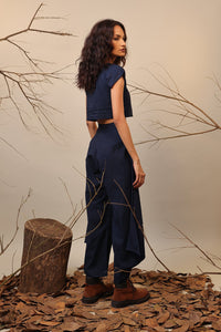 Raglan style crop top made in handspun cotton teamed with pleated cowl pants with waist band and side button opening with side pockets. Total set comes in 2 pcs.