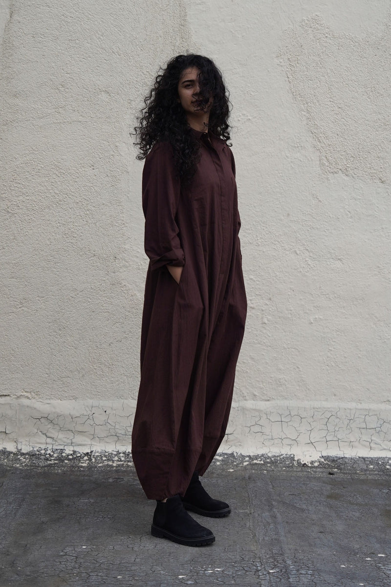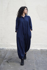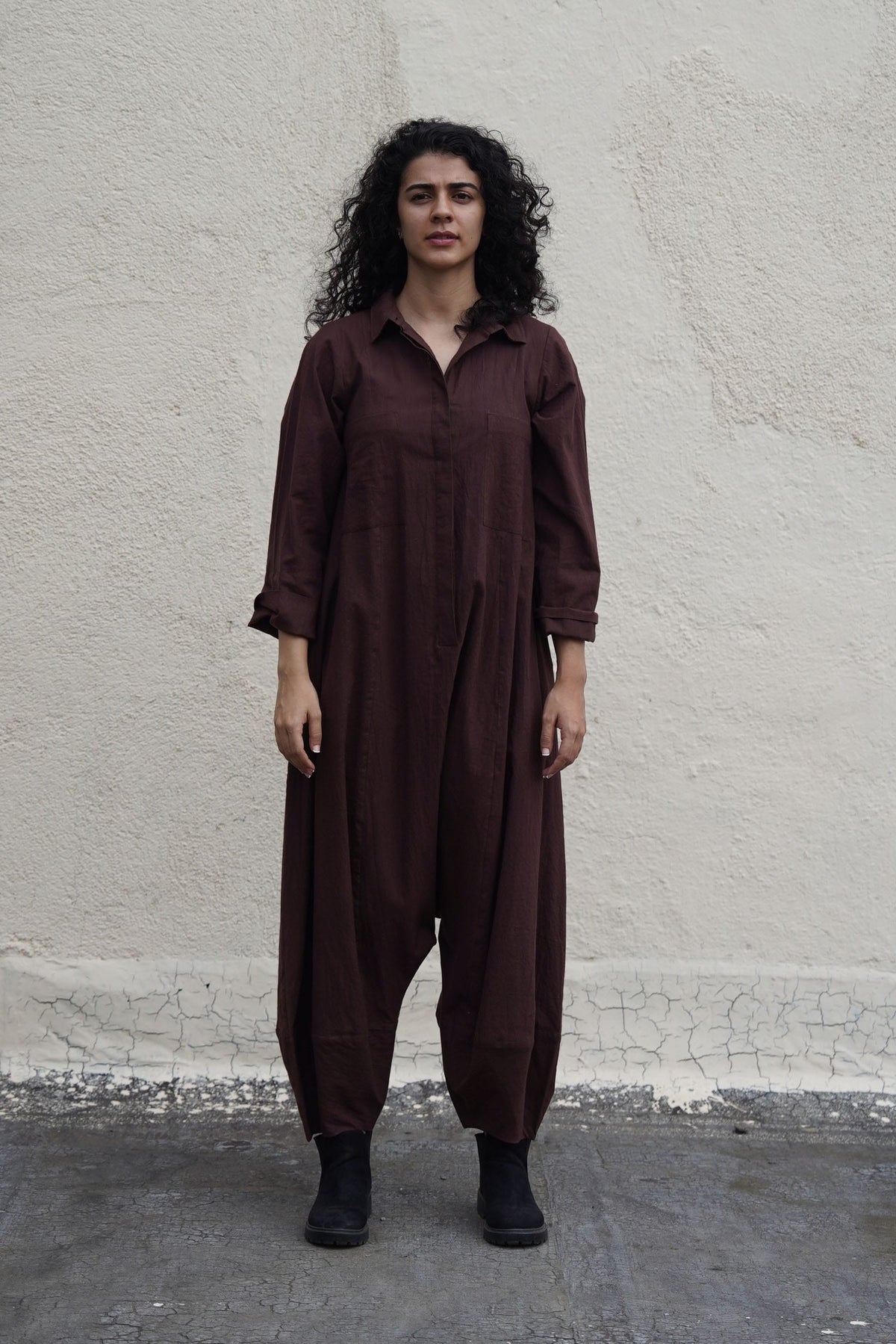 A sleek and easy to wear jumpsuit crafted in soft handwoven cotton fabric, featuring a sharp collar and front button opening for added ease. Designed for comfort and style .