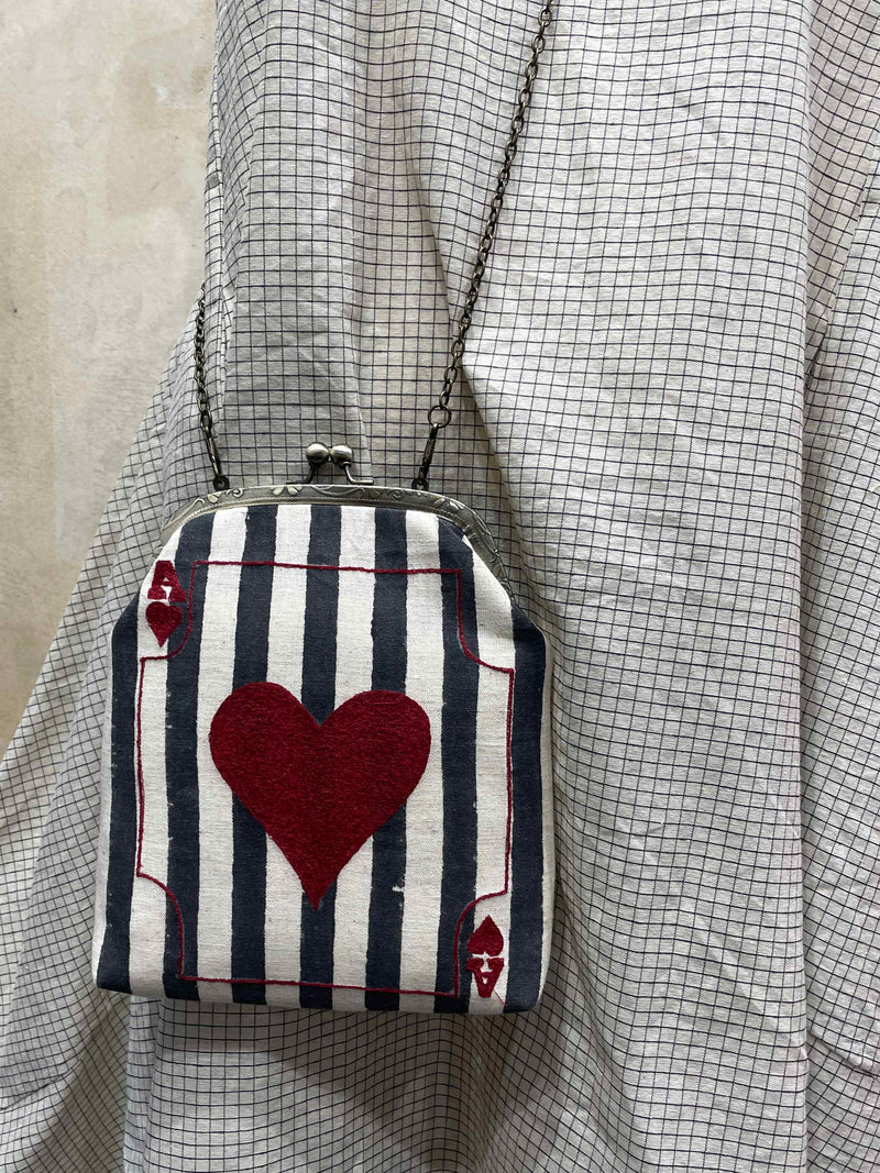 Beautifully hand-embroidered bags made in handwoven cotton with hand-block printing. Brass frames with carvings and a long chain that is detachable for cross-body. Can easily fit in your cell phones and essentials. Perfect for your Diwali parties !! Amp up your Taash outfits with a matching Card Clutch.