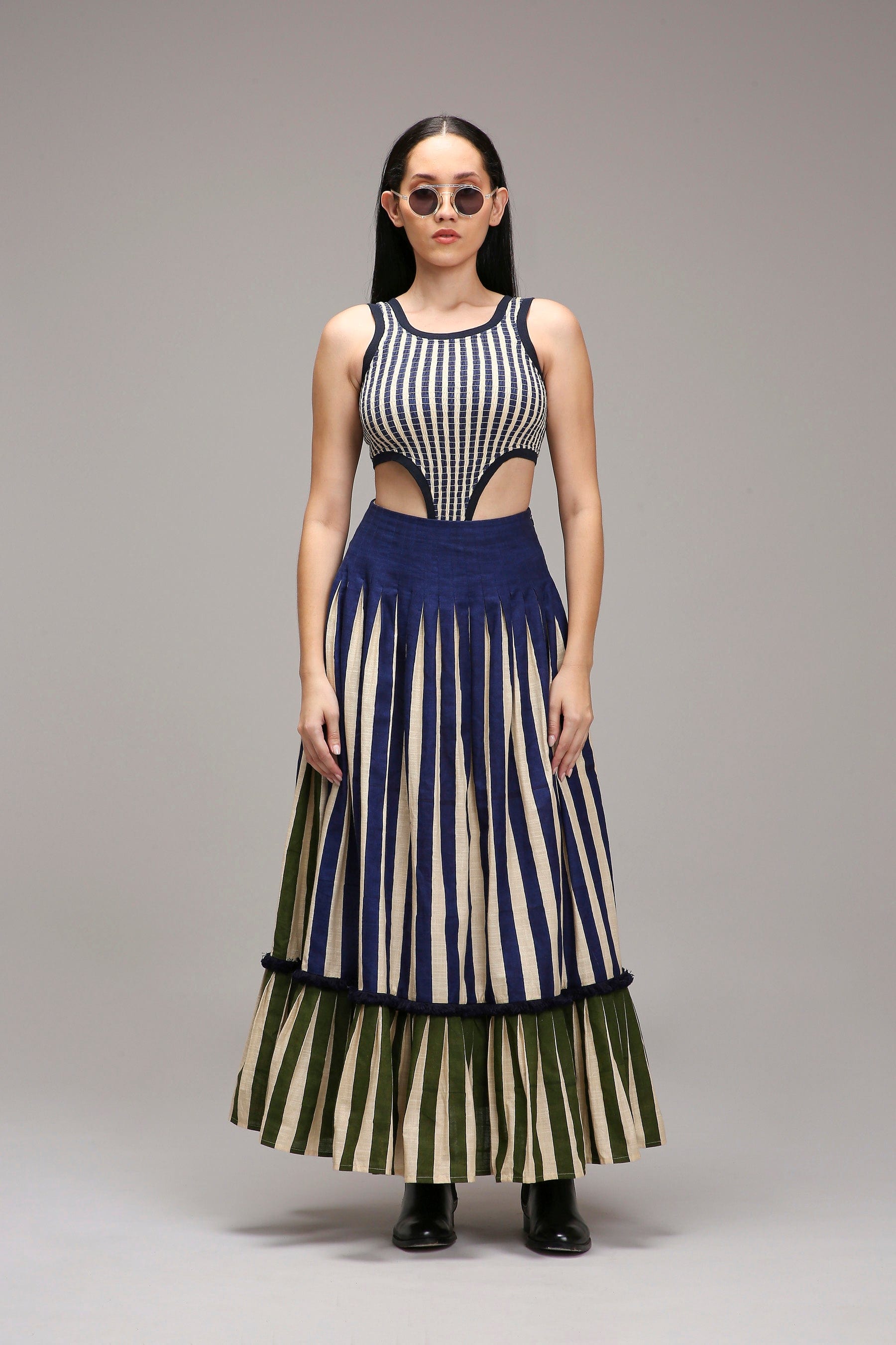 Crafted from handwoven cotton with hand-block prints, this set pairs a dual-striped skirt with a smocked bodysuit. The skirt features pleated details, contrasting side pannel, side pockets, and a fringed hem, while the fitted bodysuit offers ribbed edges for comfort. Can also Style it with a trench, or dupatta from the collection for a complete look.