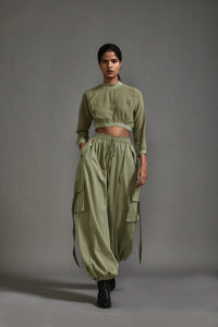 A crop-top in textured cotton with ribbed waistline, neckline and sleeve hem with Baggy-fit cargo pants with strap details on pockets, Elastic waist and hem.