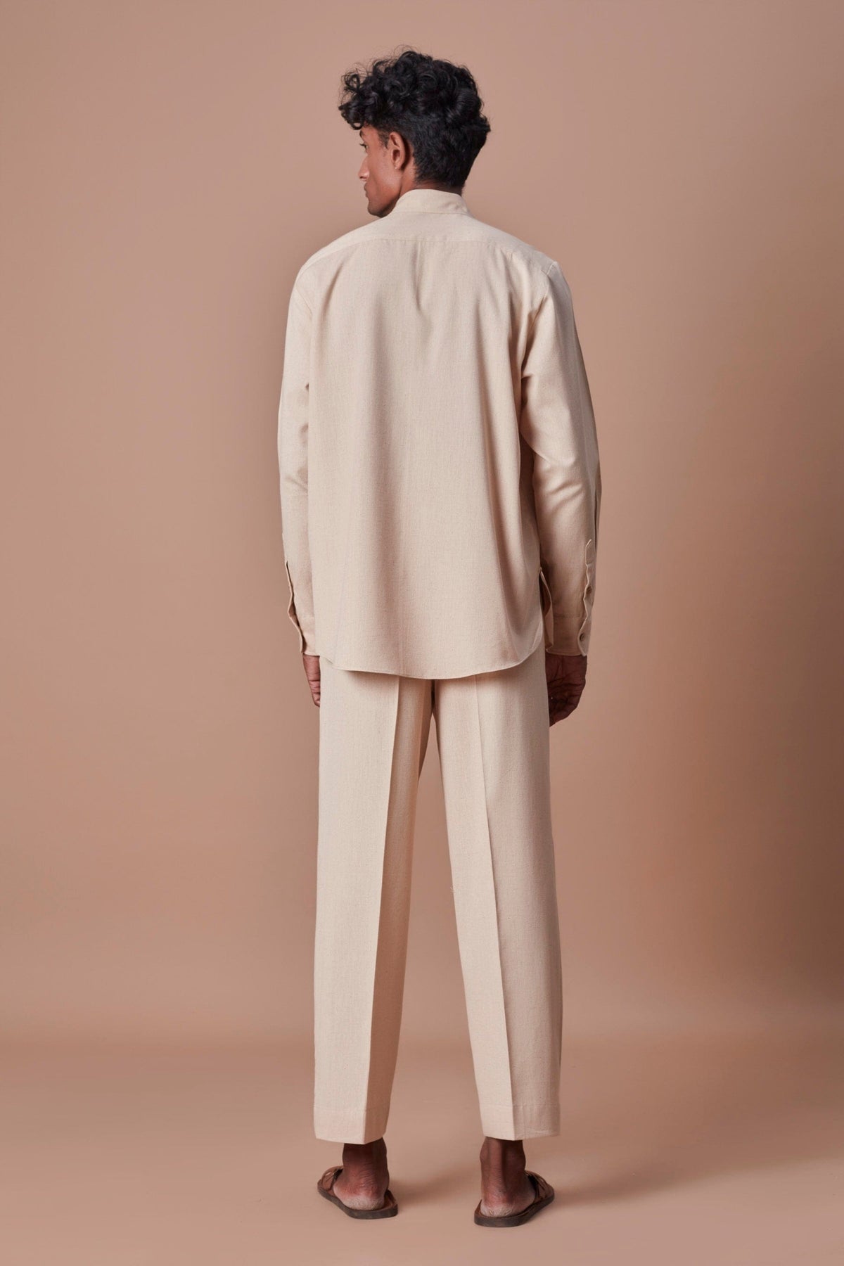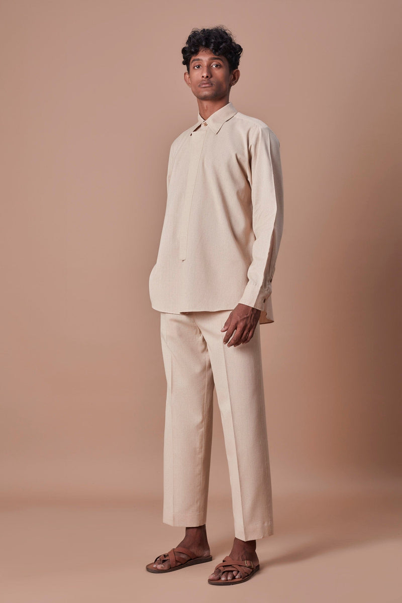 This Shirt is a classic add on to your basic shirt wardrobe. The extended placket and big collar gives an edgier and smart look. These easy and classy ankle pants will compliment both your casual and formal look. The front crease makes it a perfect fit. This set if perfect for formal occasions.