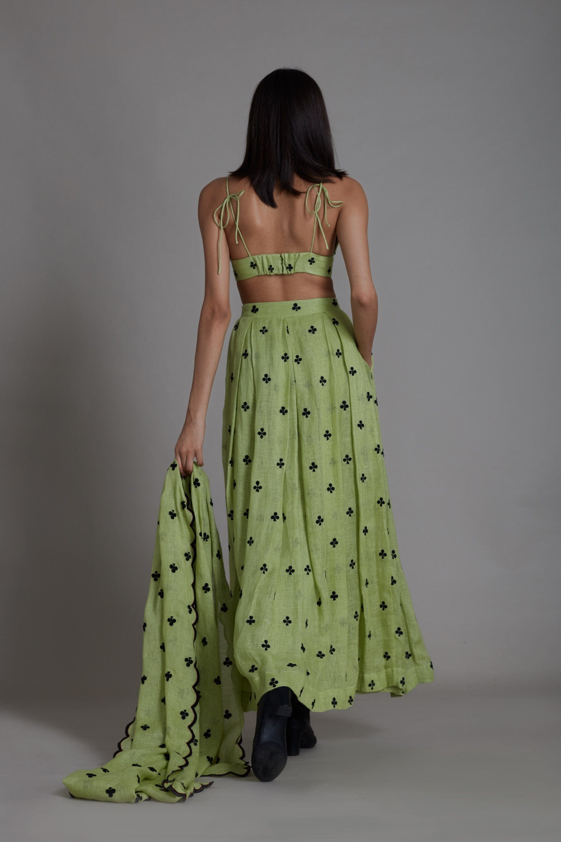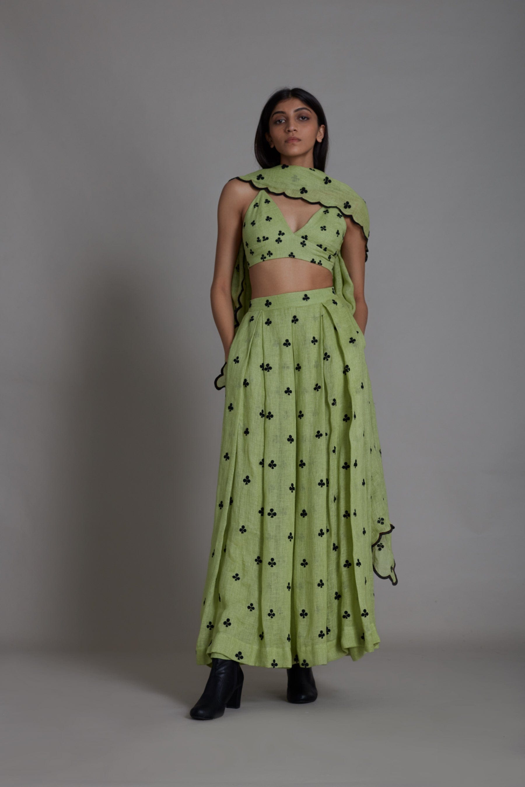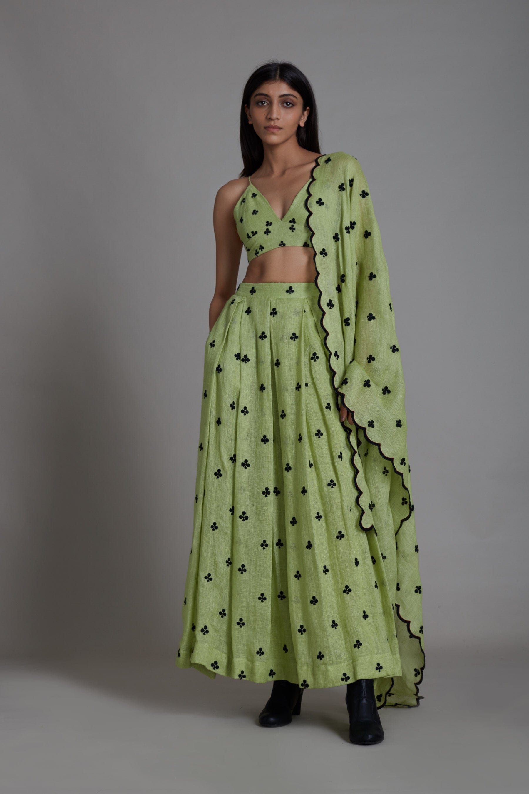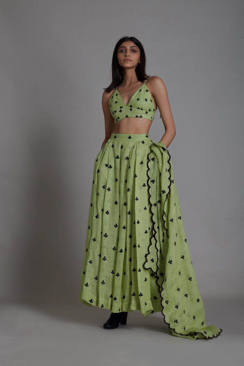 An interesting and modern take on the traditional lehenga set. The bralette, lehenga and scallop stole are made in pure linen with intricate all-over thread embroidery. You can even style it with a cover jacket from our collection for a complete festive look.