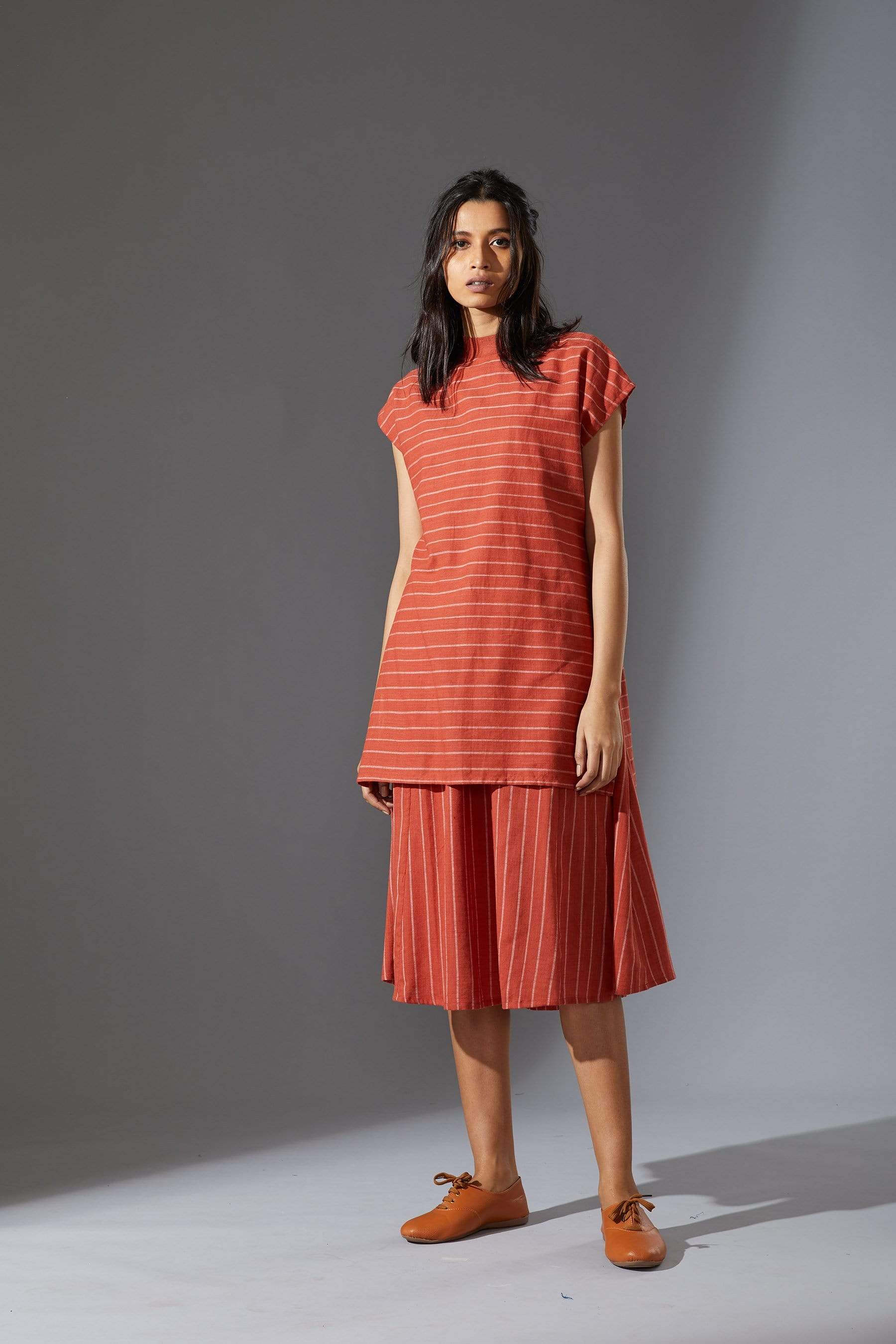 A fun layered dress made with handwoven cotton comes with a ribbed t-shirt neck. Style it with a belt and sneakers to complete the look !!