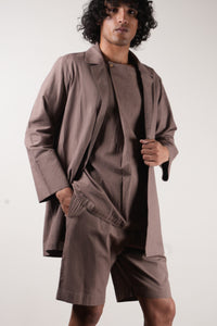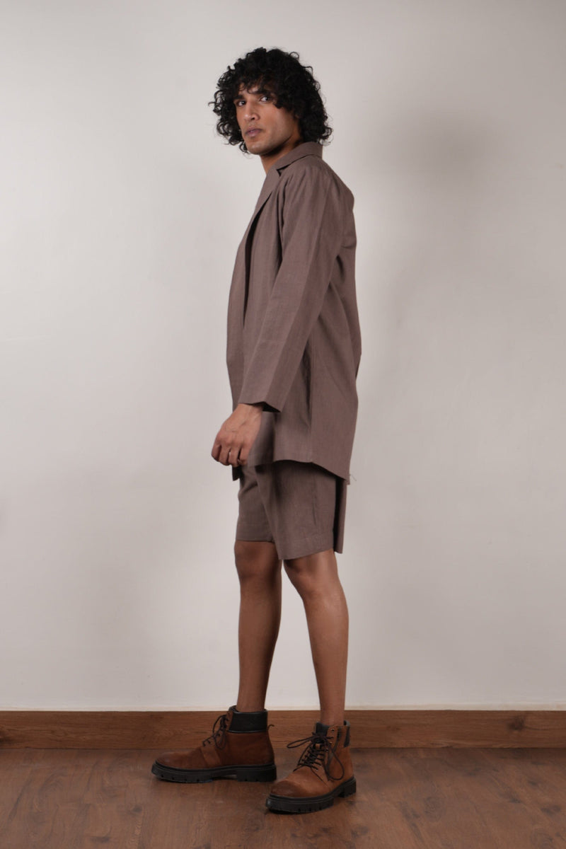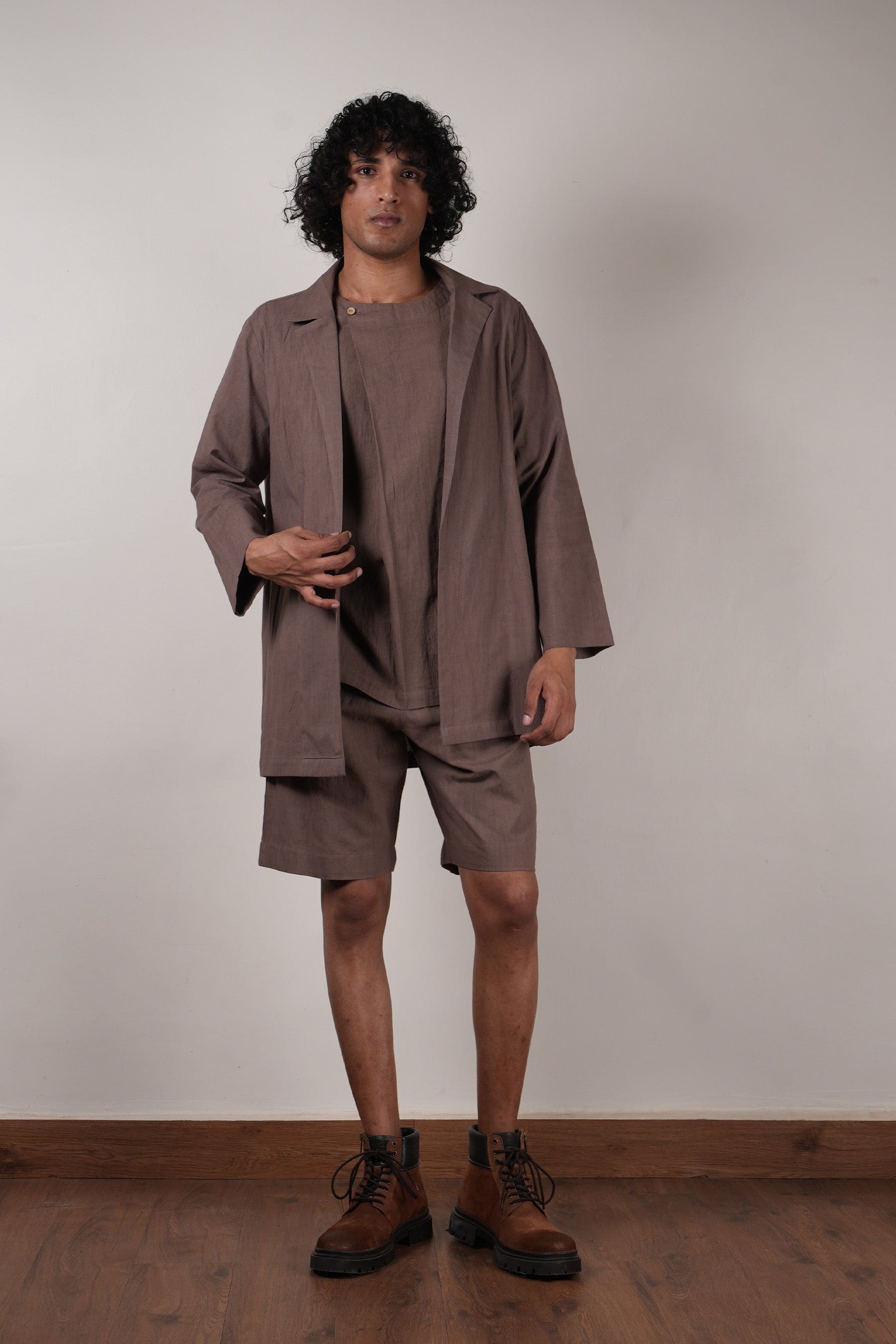 A half sleeve t-shirt and shorts with jacket set all in handwoven cotton. This set comes in 3 pcs.