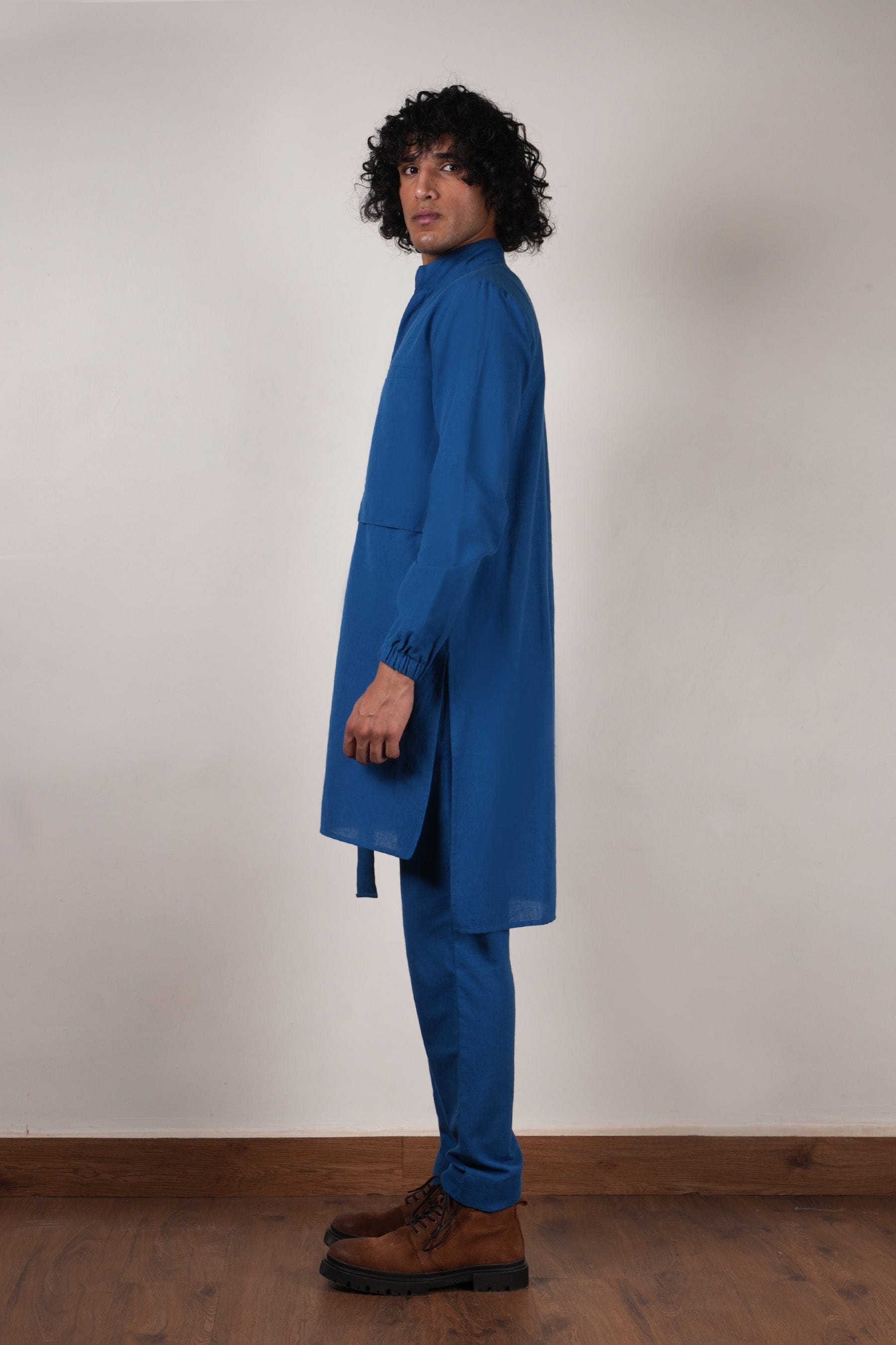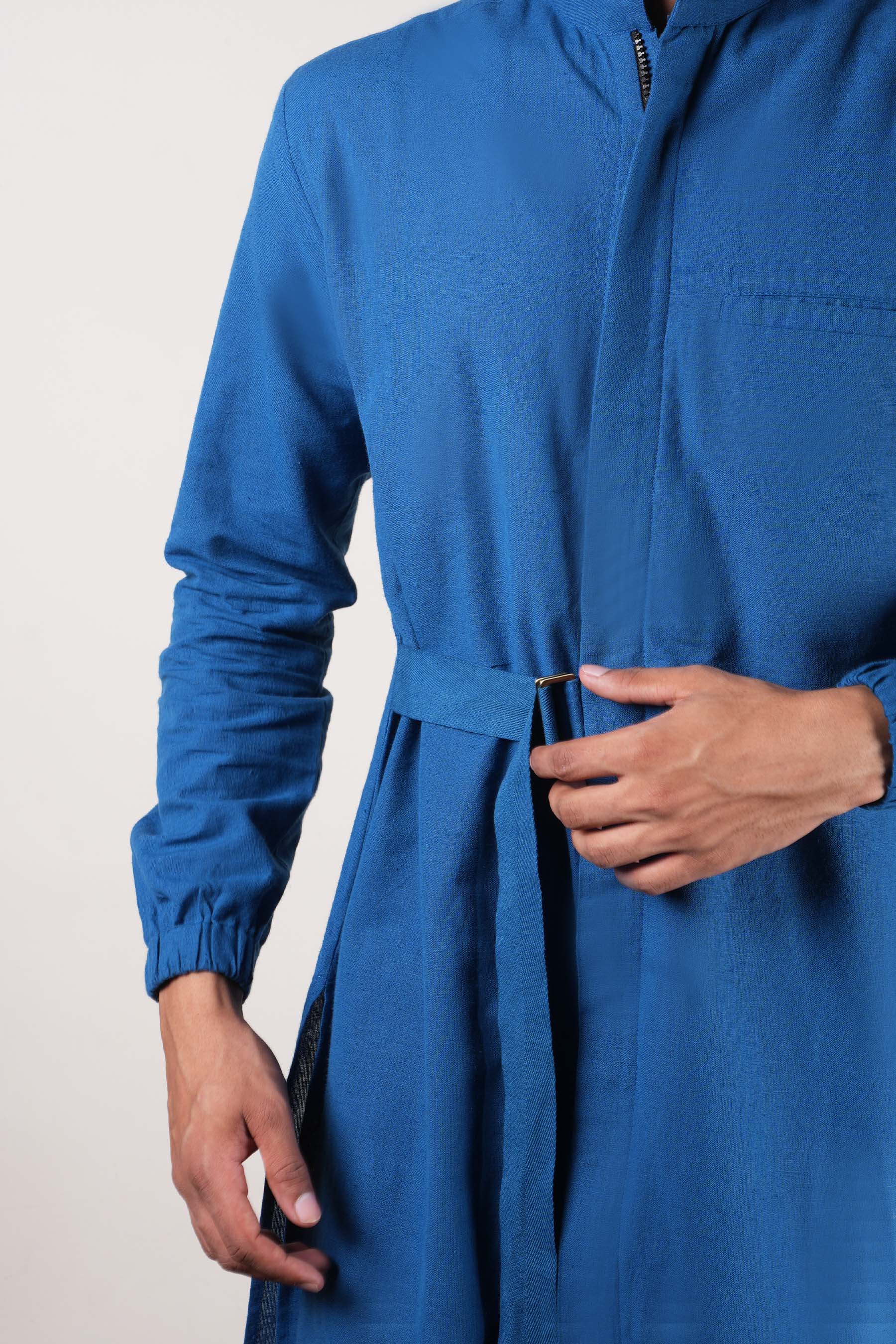 A classic kurta with a front zipper, sleek panel,functional pockets,and a one-sided waist belt for modern,structured look.