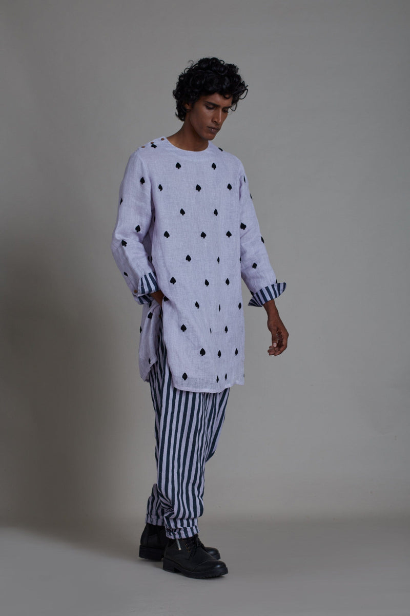 This linen kurta is great for the festivities. Handcrafted in rich linen and thread embroidery this is a perfect fit for any occasion. The side button and side pockets add a definition to the kurta. Team it up with balloon pants from our collection for a complete festive look.