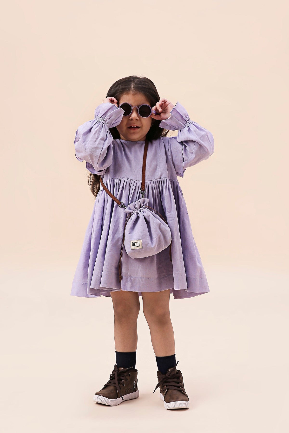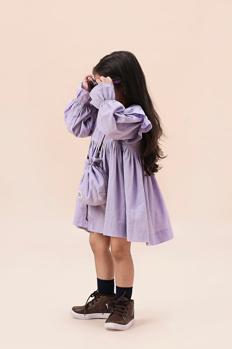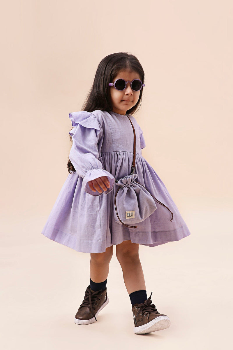 A cute, stylish and minimal summer dress with ruffle detailing around the shoulder. Plain colour of our handwoven fabric dyed using chemical free dyes making it perfect for a childs skin. Back opening with buttons. 2" fold at the bottom makes it possible for kids to enjoy wearing the dress even after growing taller. Soft elastic on the sleeves helps you adjust the sleeve length.