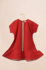 An A-line dress with flared hem, contrast piping detailing and comes with a matching hat.