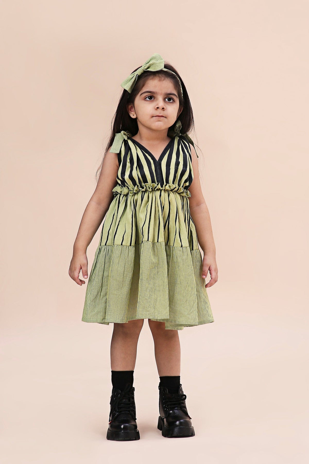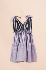 A tiered mixed striped dress made with soft cotton and hand block print with chemical free dyes. Comes with a bow headband..