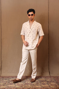 Overlap jacket style shirt made in embroidered handspun kala cotton teamed with the straight pants in handspun cotton. Set of 2 PCS.