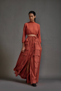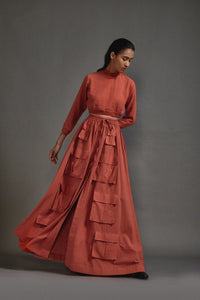 A long safari skirt with elastic waistline, cargo pockets and slit at the centre.