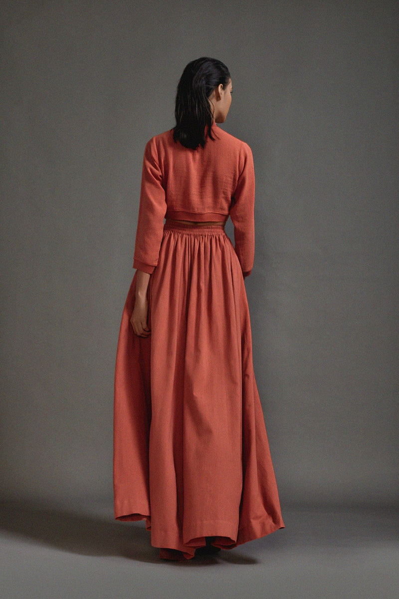 A set crop-top in textured cotton with ribbed waistline, neckline and sleeve hem with long safari skirt with elastic waistline, cargo pockets and slit at the center