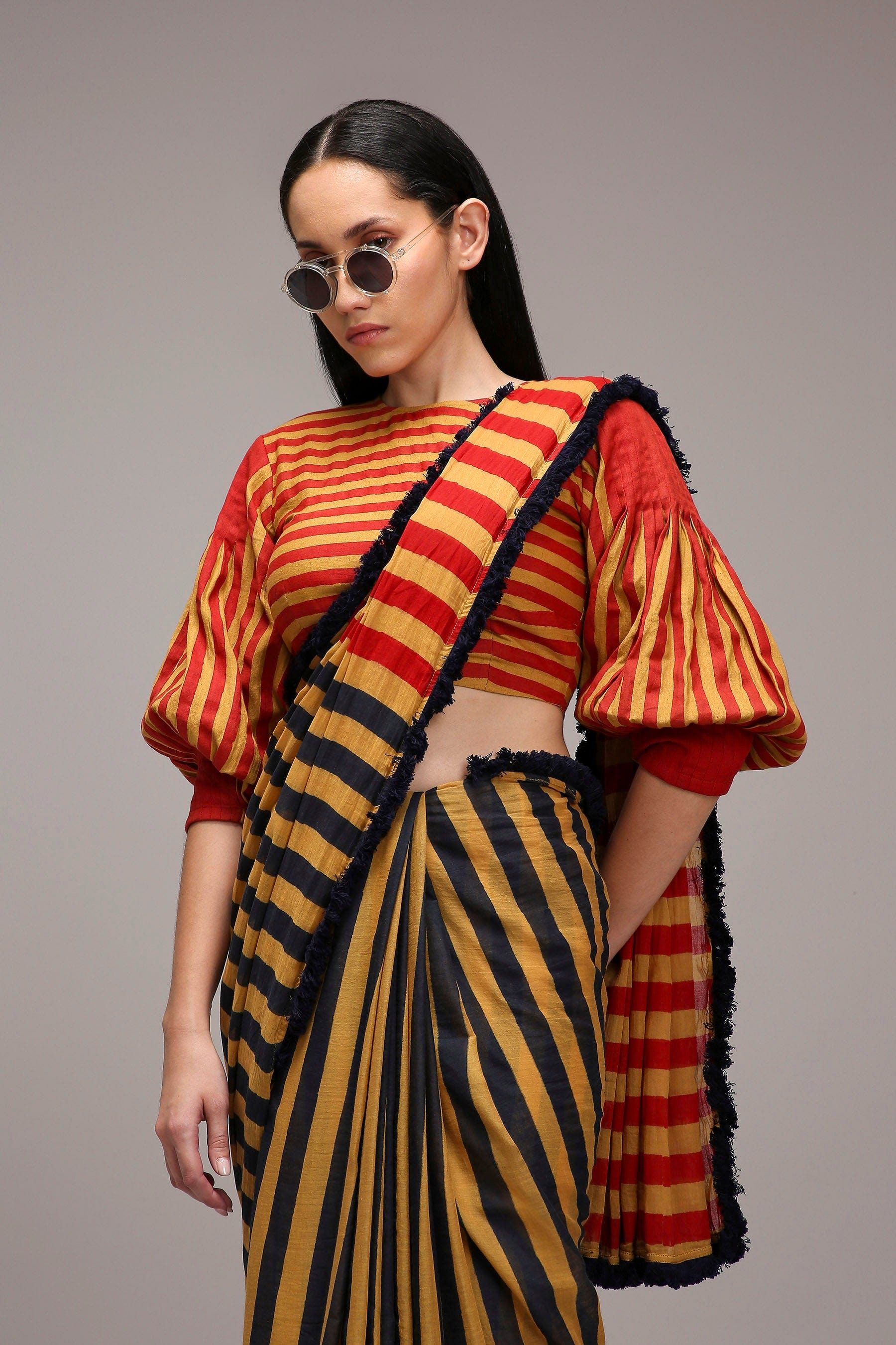 Crafted from handwoven cotton with hand-blocked stripes, this top features pleated detailing on the upper and lower sleeves, elasticated hems for structure, and a back button opening for ease. Paired with a mul cotton saree showcasing intricate hand-block prints and fringed tassels at the ends, this set beautifully blends traditional craftsmanship with a modern silhouette. Perfect for styling with elegance and ease.