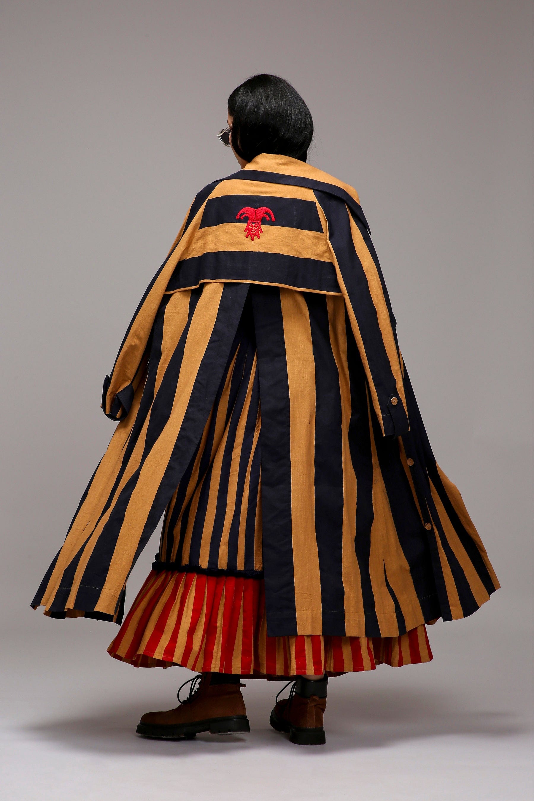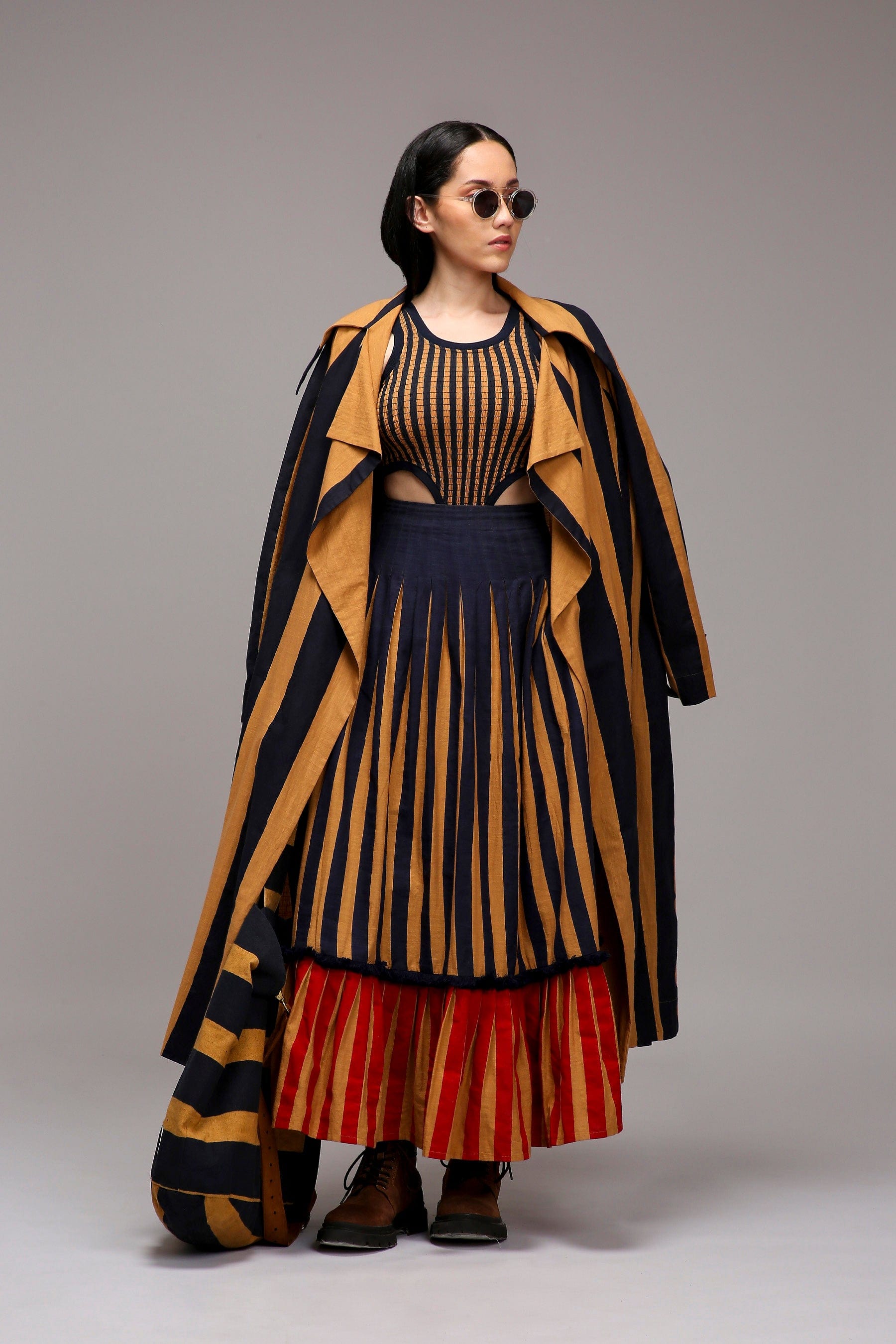 This set includes a handwoven, hand-block dual striped skirt with pleats, contrasting side pannel and a fringed hem, a fitted smocked bodysuit with ribbed detailing, and a joker jacket featuring bold joker embroidery, button details, and a back slit. A modern look with artisanal charm.